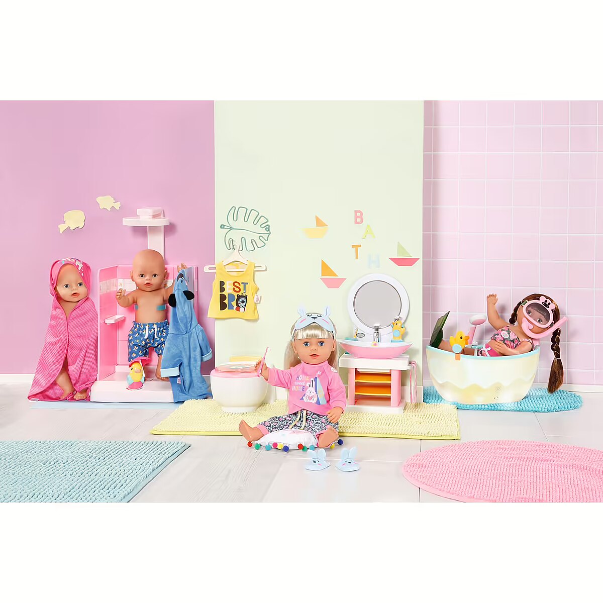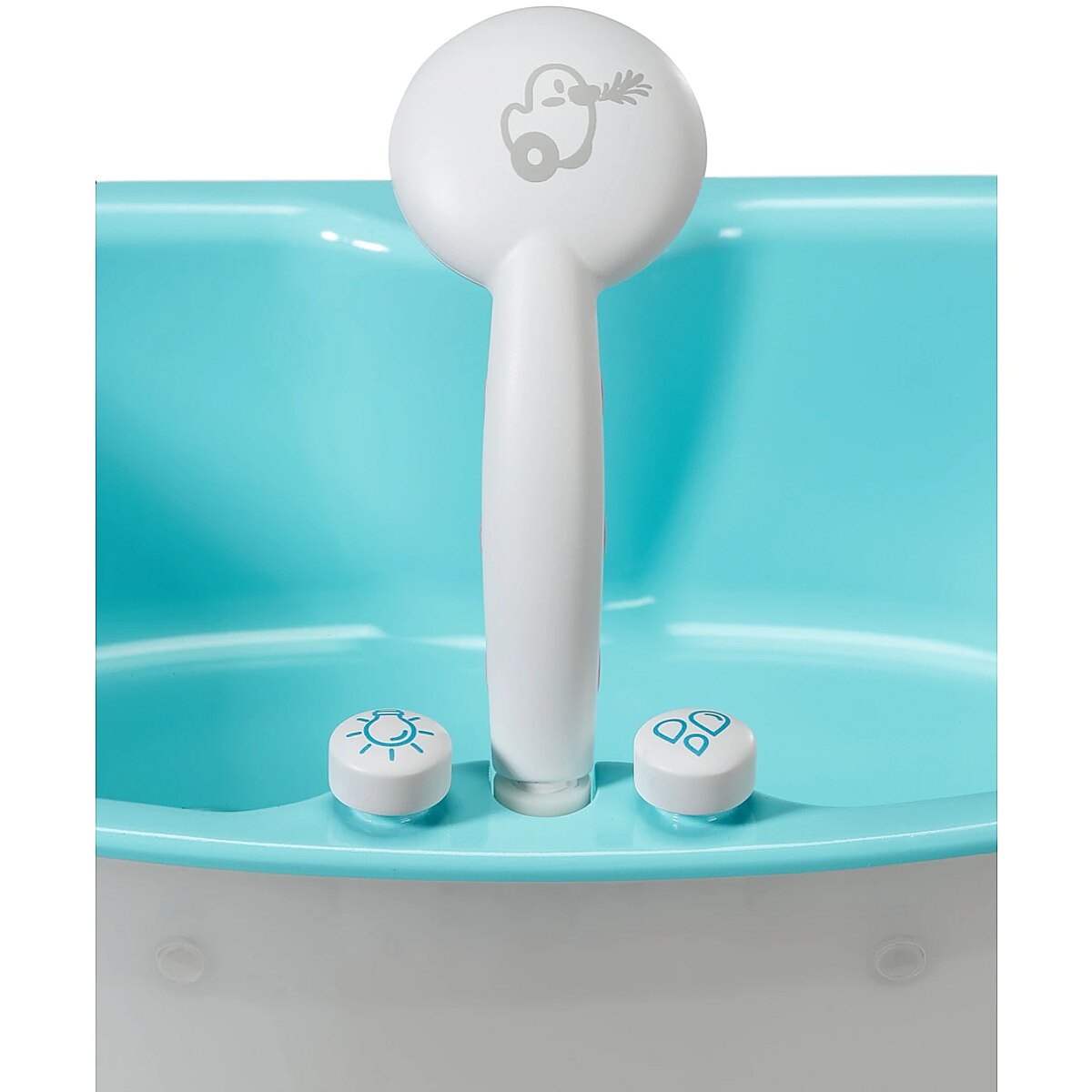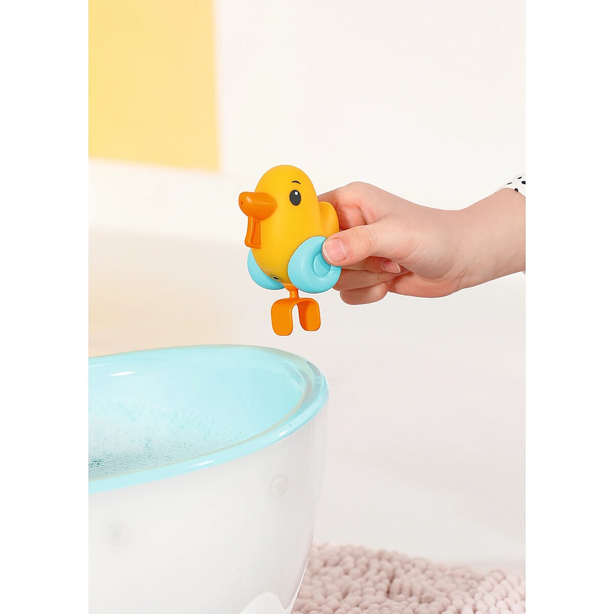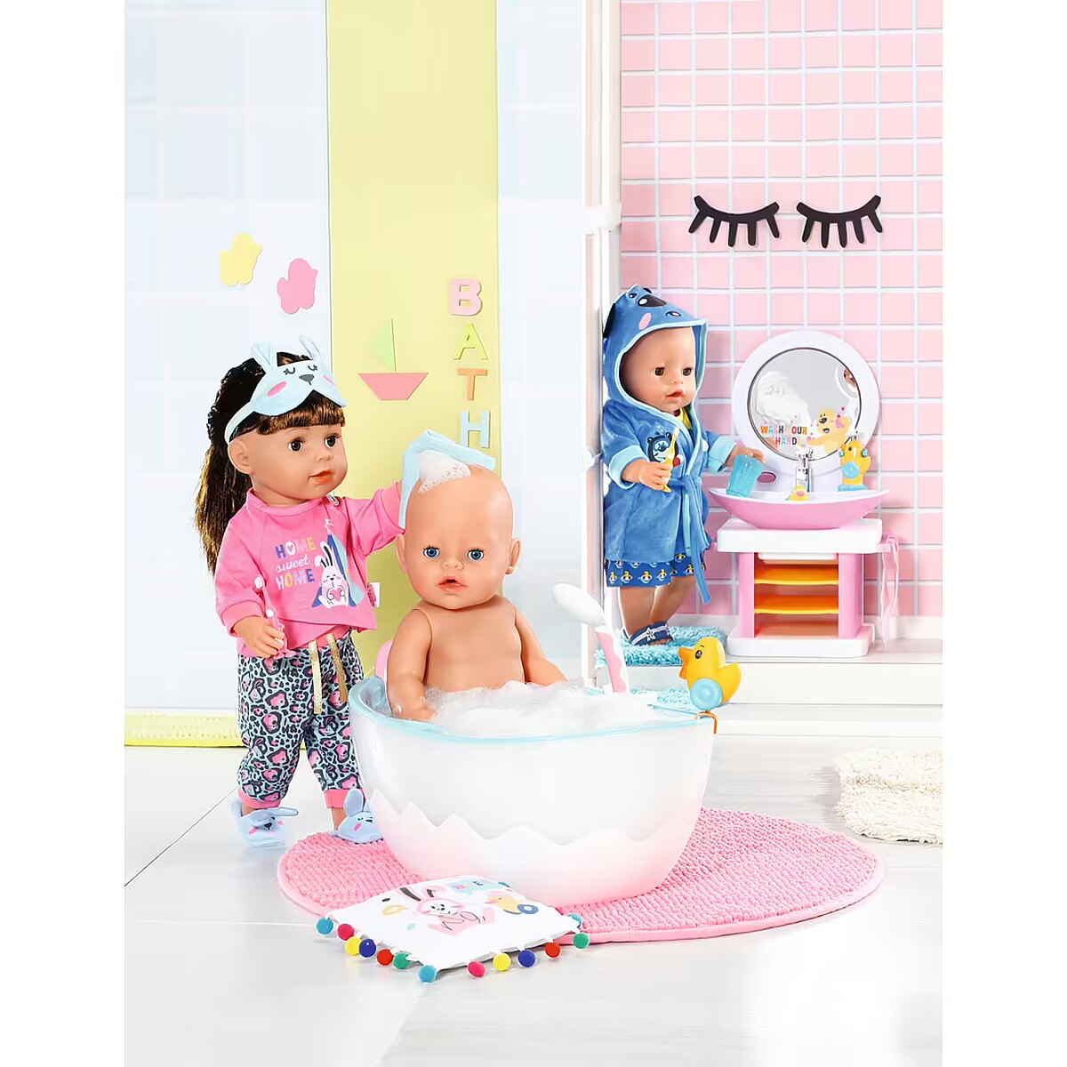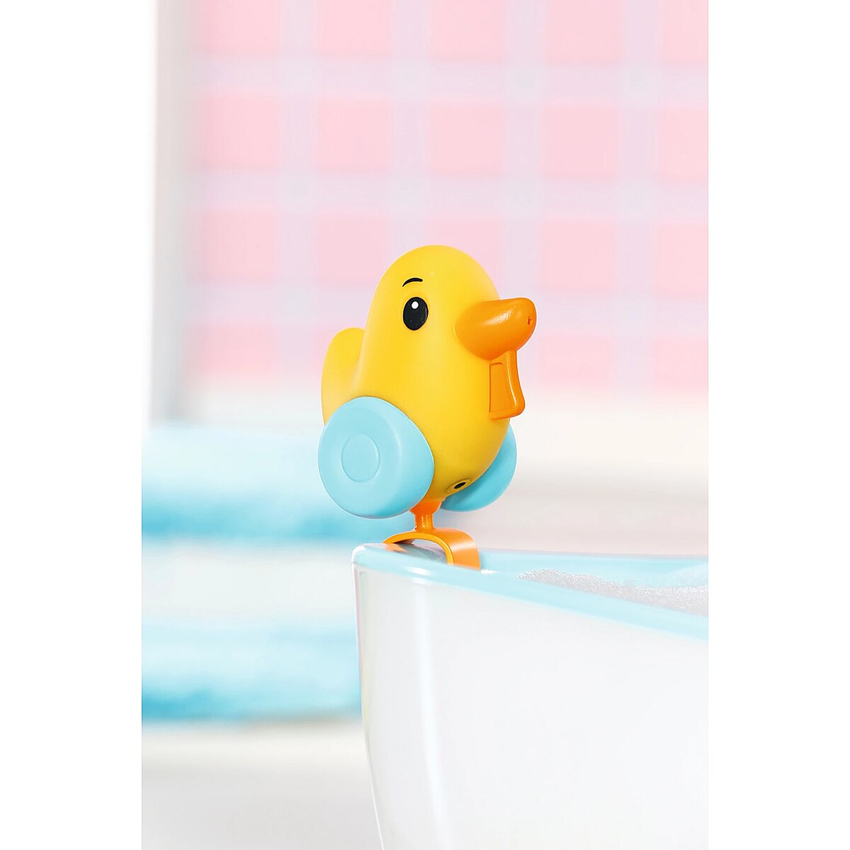 LongDesc - Take aim, fire, aaaand… GOT YOU! Brother is really wet now. A bath duck like this is just perfect for water fights. You can position it anywhere along the edge of the bathtub, just like the heart-shaped pillow. The tub is water-blue on the inside and white with an embedded wave shape on the outside. If you press the light switch next to the shower, the outer shell of the bathtub lights up in alternating colours. The shower button activates the pink and white shower. If the bathtub is empty, you can hear splashing and the typical watery sounds. If the bathtub was filled with water beforehand, the water now runs through the shower head, which can be tilted towards the bathtub so that no water drips outside the tub. You can also take out the hose in order to give BABY born a good wash or to soak Brother a little bit more. - High-quality accessories for the BABY born branded doll.- For enhanced, diverse and long-lasting fun through play.- Suitable for dolls in the sizes 36 cm and 43 cm.- Requires batteries (not included). BABY born Bath Bathtub with light and sound effects. Includes pillow and squirting duck.