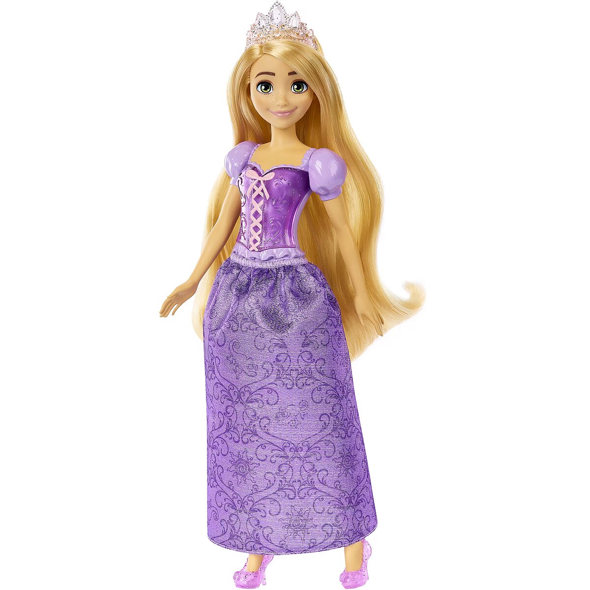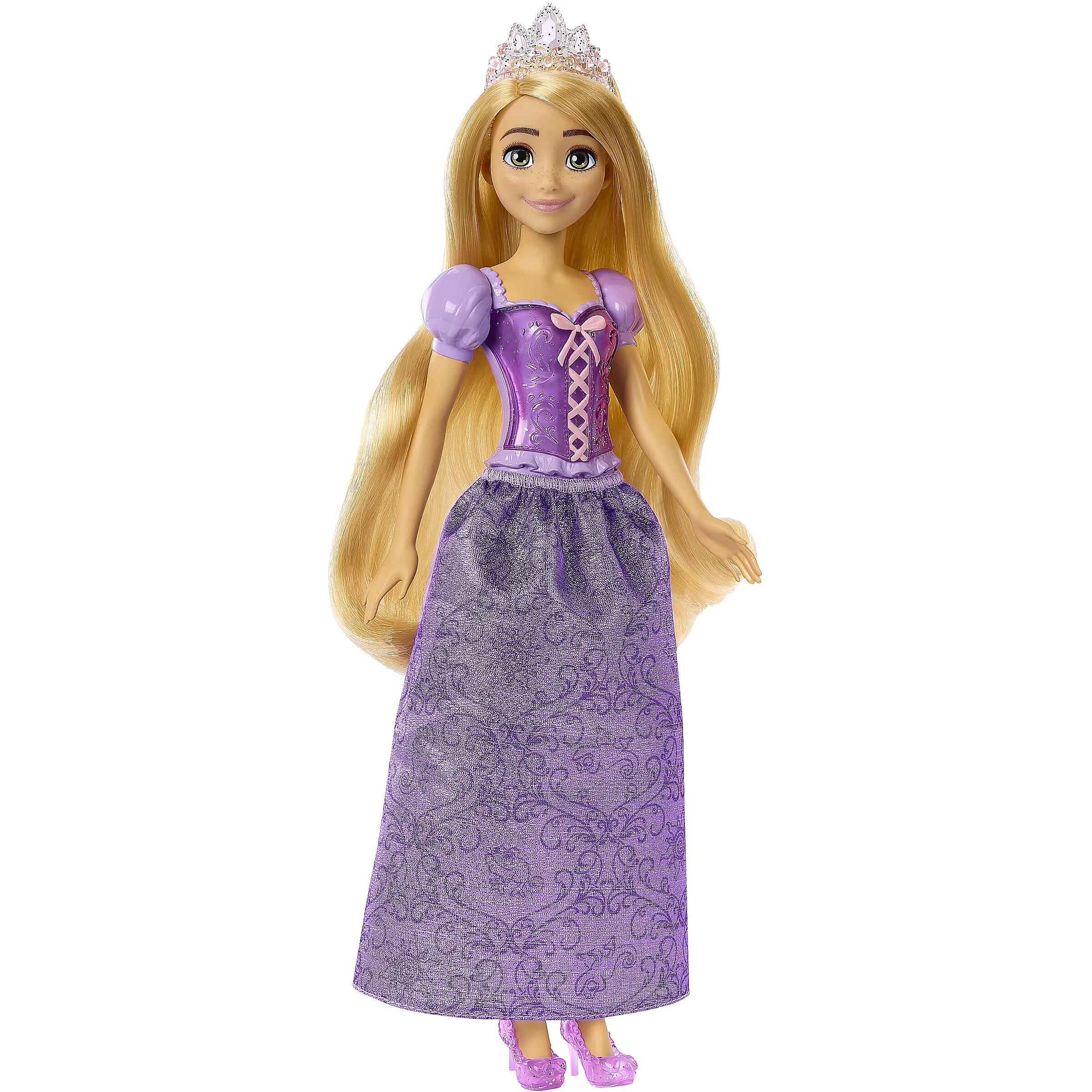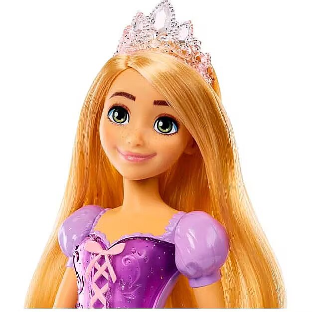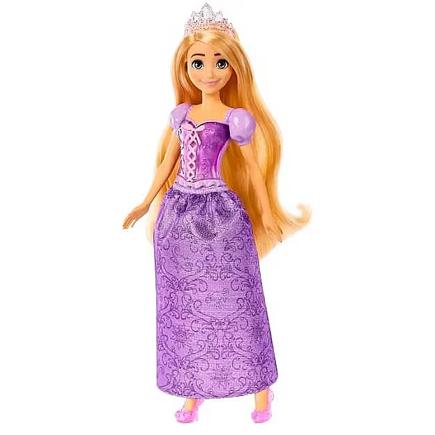 LongDesc - Meet this Disney Princess Rapunzel doll, inspired by the vibrant and creative heroine from the beloved Disney Tangled movie! This posable fashion doll is shown in a sparkling outfit and accessories that include shoes and a tiara. In her signature look inspired by the movie, this Rapunzel doll is ready for any adventure! Doll cannot stand alone. Colours and decorations may vary.
