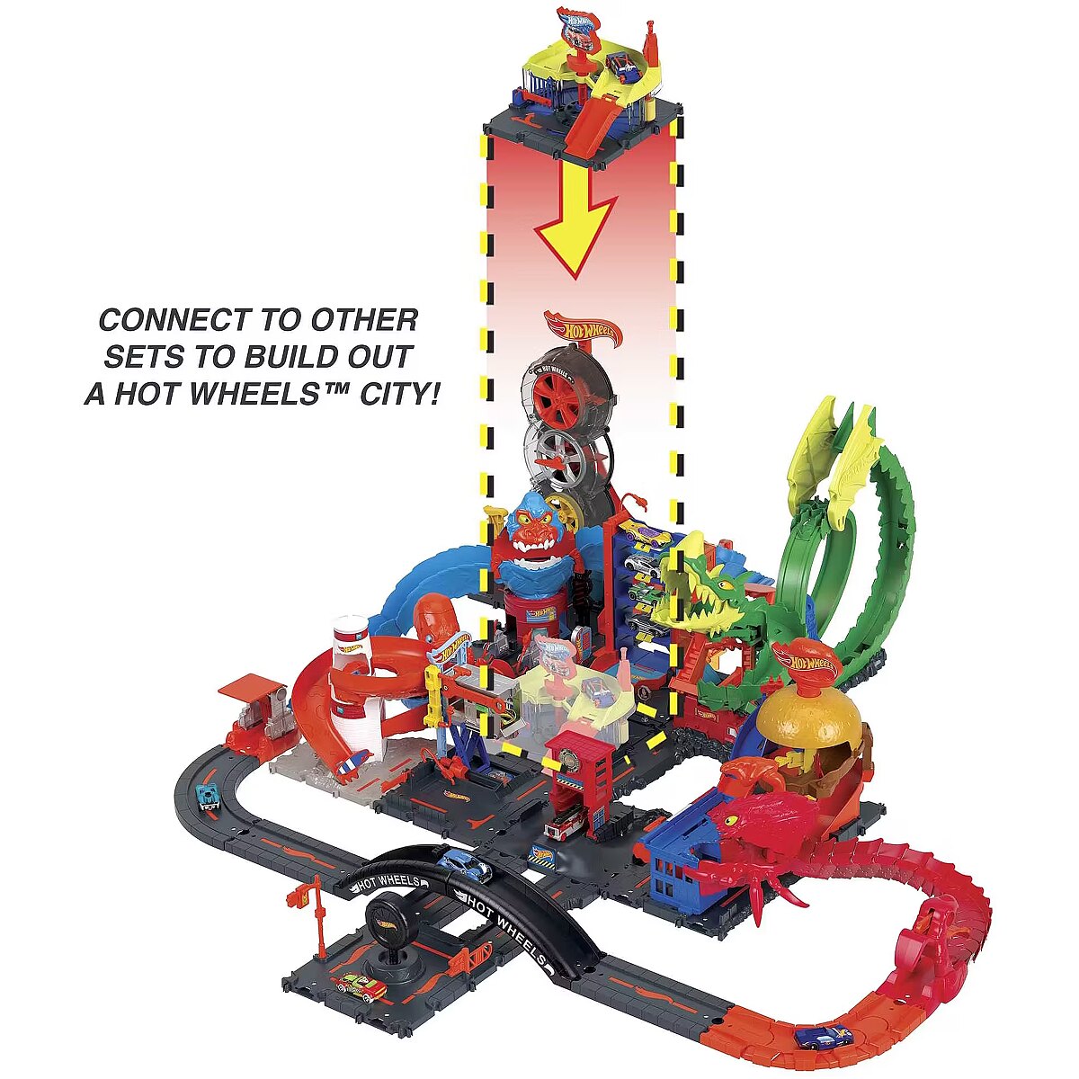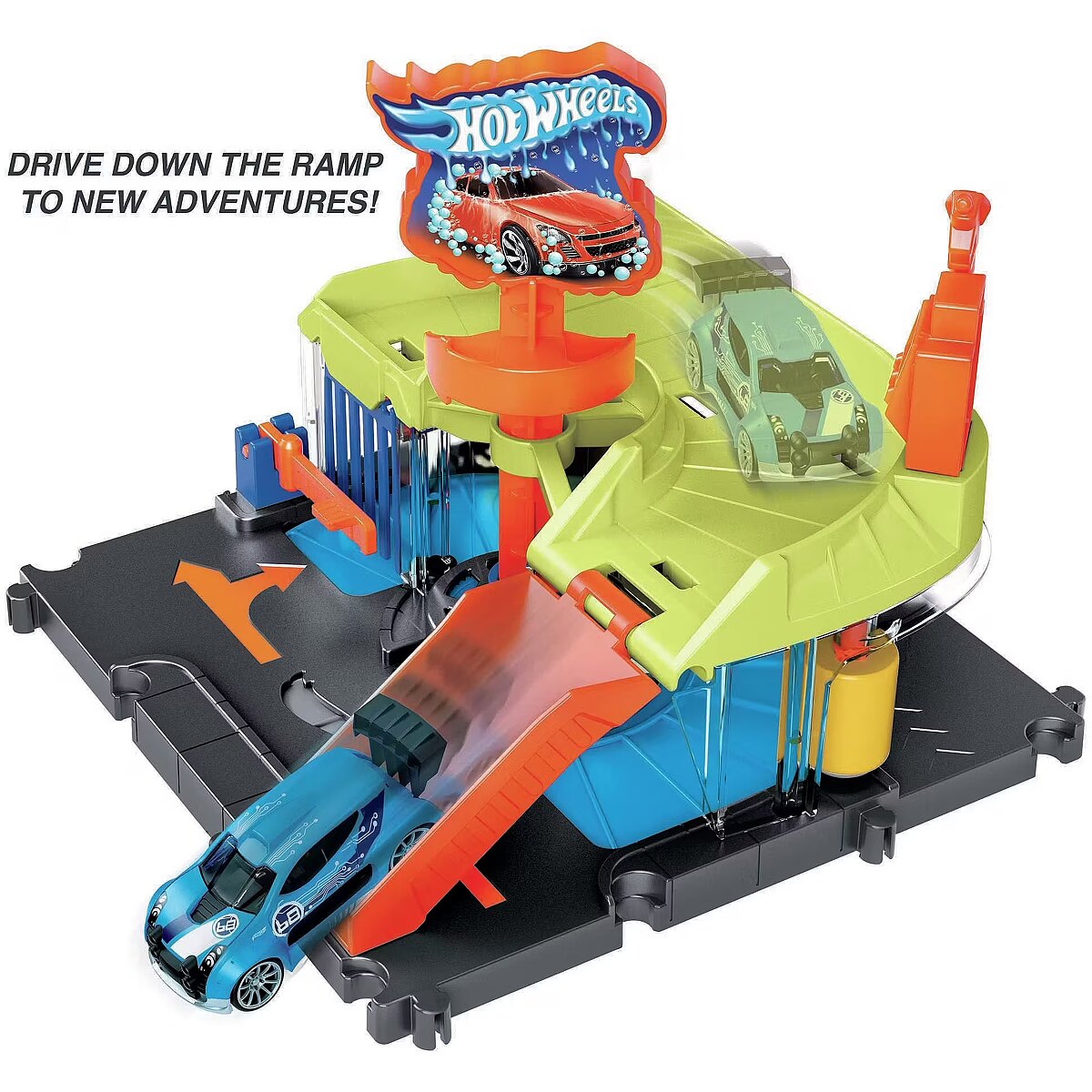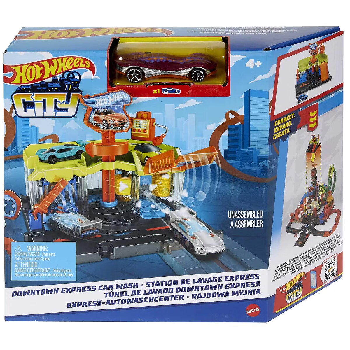 Description - After battling the vicious creatures of Hot Wheels City, head to the car wash to clean up the dirt and debris of city life. Rotate the logo sign and your car will automatically drive through the car wash, always visible through the clear windows. Drive up the ramp to refuel or park, then set off on other adventures. The set connects to other Hot Wheels sets via multiple connection points and comes with one Hot Wheels vehicle to play with straight out of the box. Each sold separately, subject to availability. Colours and decorations may vary. When you're battling toxic creatures, every car needs a good cleaning in the Hot Wheels City Downtown Express Car Wash set before heading off on more adventures. Cool, sliding game details add realism and fun! Kids rotate the logo sign and the cars automatically run through the wash, which includes a foam roller and drying tabs to ensure complete coverage. Set includes 1 Hot Wheels car for instant fun and play right out of the box. Combine the Hot Wheels City Downtown Express Car Wash set with other sets to build a unique world of fun and adventure with cool features that enhance play! Each set sold separately. This is a great gift for kids ages 4 to 8 and timeless collectors who love the detail and character of Hot Wheels sets.