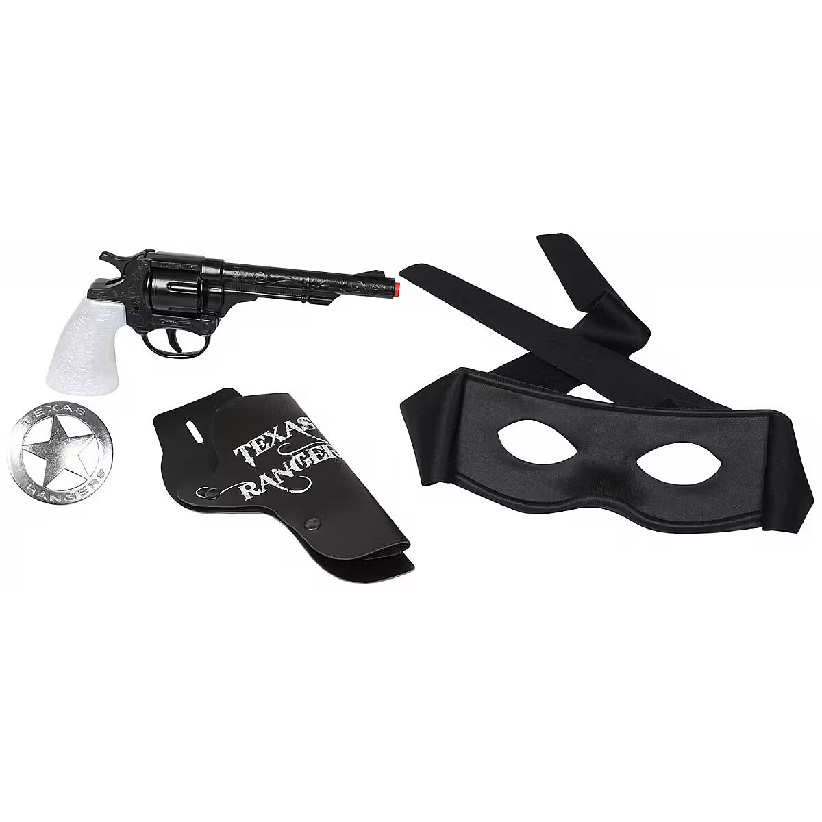 Description - Zestaw zawiera: metalowy rewolwer na 8 naboi z bębenkiem, kaburę, maskę kowboja, odznakę oraz pasek. Wiek: 3+.