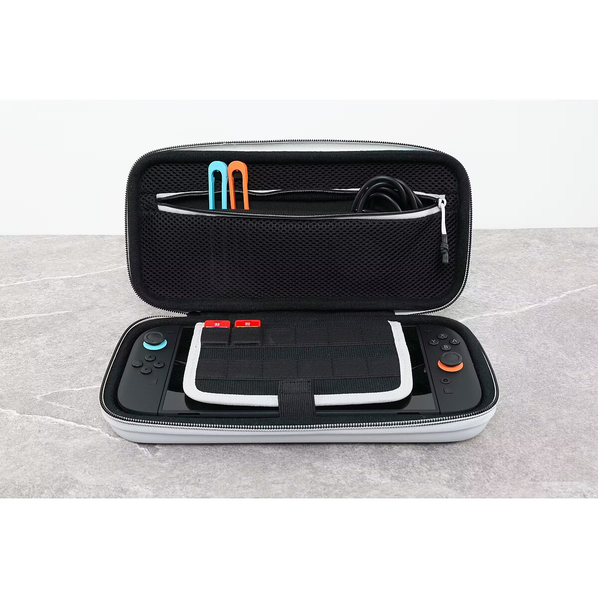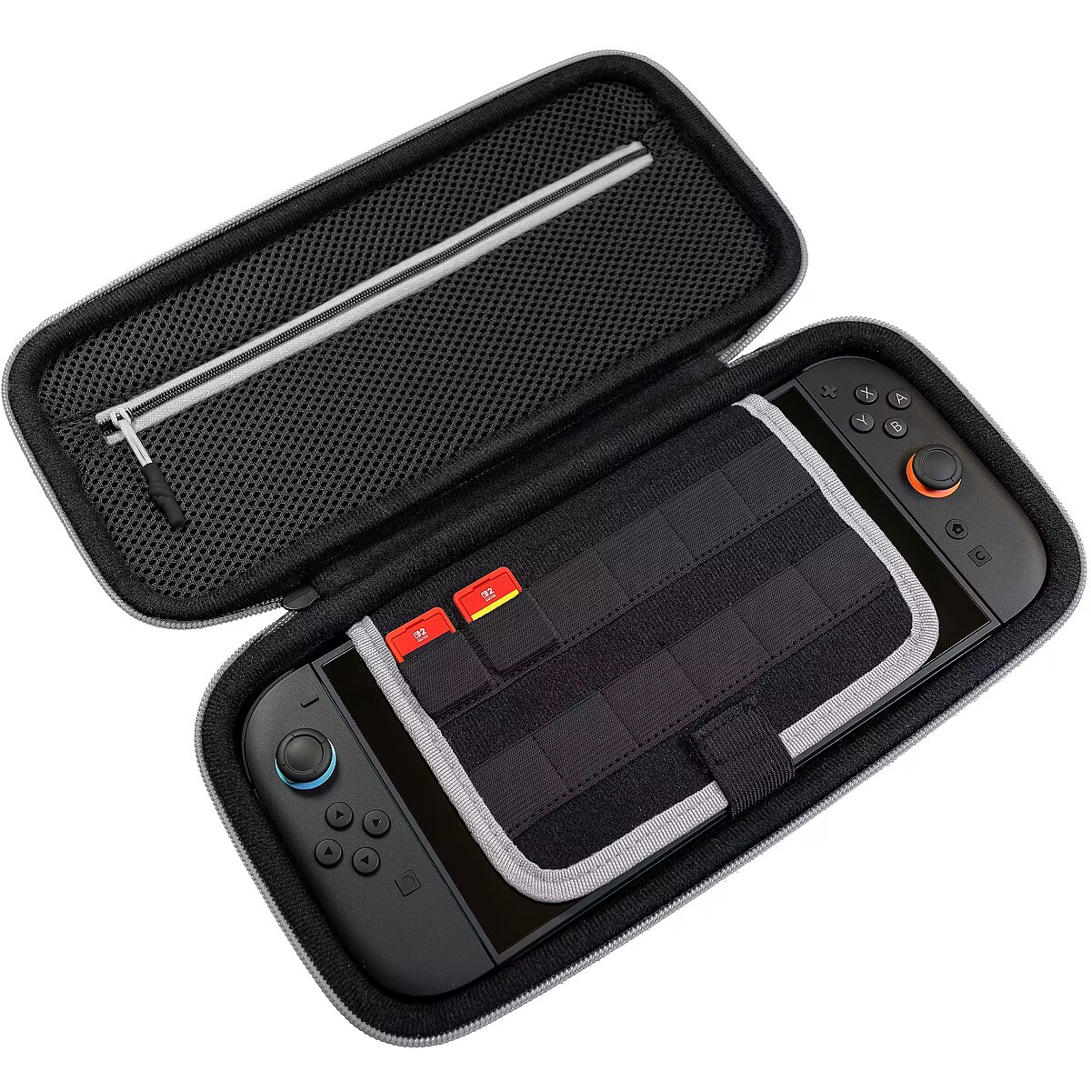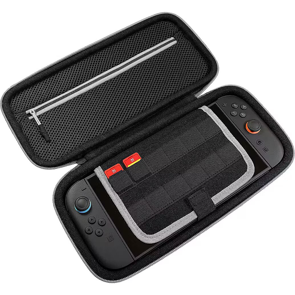 Keep everything organized on the go. Interior features include game card slots and a mesh zippered pocket for storing small accessories like cables, earbuds, or cleaning cloths. Travel-Ready Portability