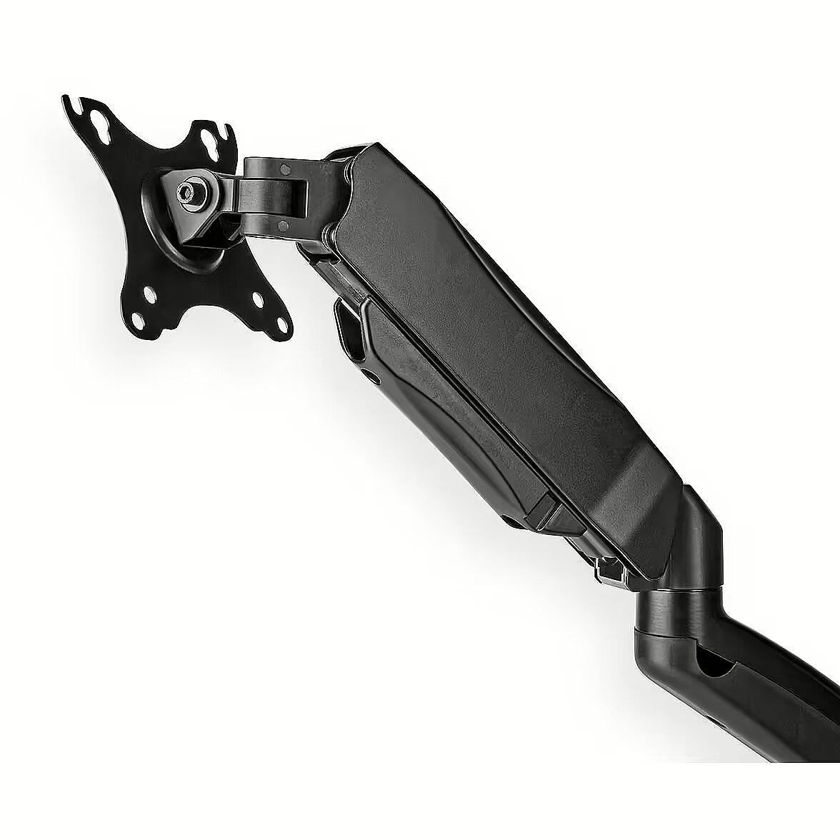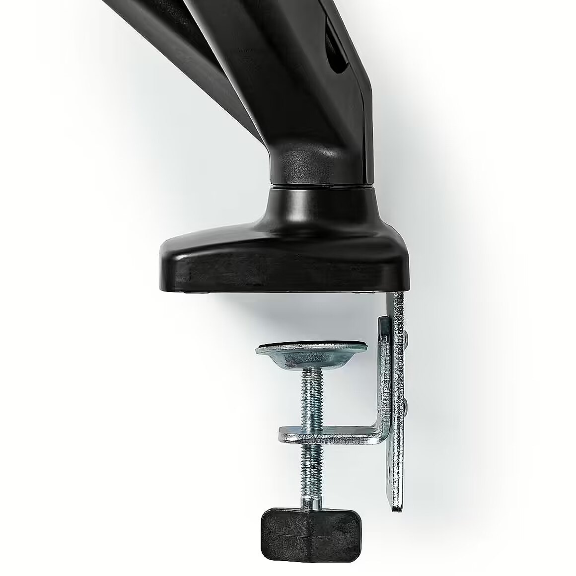 description_lv - Divu monitoru galda stiprinājums līdz 32″ ekrāniem, gan plakaniem, gan izliektiem. Gāzes atsperes mehānisms nodrošina gludu augstuma regulāciju un īpaši vieglu izlīdzināšanu. Pilna leņķa kustība: 180° pagrieziens, 360° rotācija (portrets ainava), līdz 50° slīpums ērtai skatīšanai. Iebūvēti vadu turētāji — sakārtota kabeļu organizēšana gar roku. C-veida skava ļauj vienkāršu uzstādīšanu uz galda ar biezumu līdz 60 mm. Piemērots mājas birojam, uzgaidāmajai zonai vai spēļu videi. Izturīgs dizains – atbalsta līdz 8 kg svara diviem ekrāniem kopā. Izmēri: garums 958 mm, dziļums 107 mm, augstums 453 mm; svars 3 556 g. Materiāli: metāla rokas un ABS plastmasa ēteriskai izturībai.