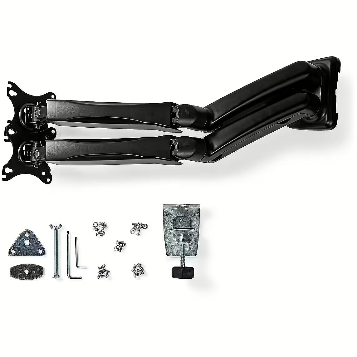 description_ru - Настольный кронштейн на газовой пружине для двух мониторов до 32″ — плоских или изогнутых. Газовая пружина обеспечивает плавную регулировку высоты и лёгкое выравнивание. Полный диапазон движения: наклон до 50°, поворот 180°, вращение 360° (портрет–ландшафт). Интегрированная система управления кабелями — провода аккуратно вдоль руки. Быстрый монтаж при помощи C-скобы на столе толщиной до 60 мм. Подходит для домашнего офиса, ресепшена или игрового места. Прочная конструкция — выдерживает до 8 кг суммарного веса экранов. Размеры: длина 958 мм, глубина 107 мм, высота 453 мм; вес 3 556 г. Материалы: металлические рычаги и ABS-пластик для долговечности.