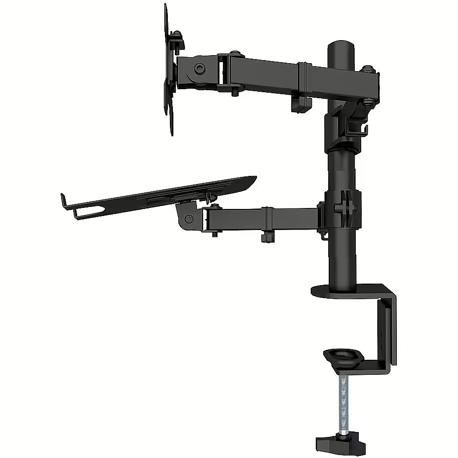 LongDesc - - Ergonomic 2-in-1 desk stand maximizes workspace by raising the screen and notebook off the desk top- Adjustable arm equipped with double joint with VESA compliant attachment supports a monitor from 13" to 32" up to 8 kg- Shelf for a laptop from 12" to 17" up to 8 kg- Offers 180 ° rotation, +/- 45° tilt and 100 to 400 mm height adjustment for optimized viewing- Supports 360° screen rotation for both portrait and landscape orientation of the video- Create a dual monitor setup by integrating the notebook as a second display- The shelf can be fully tilted horizontally for use as a stand for a projector weighing up to 8 kg- VESA standard compliant: 75 x 75, 100x100- Includes C-clamp for installation on the edge of your desk or table, no furniture drilling required- Sturdy, powder-coated steel construction- With integrated cable management system- Ideal for office, study, home, IT networking and security applications
