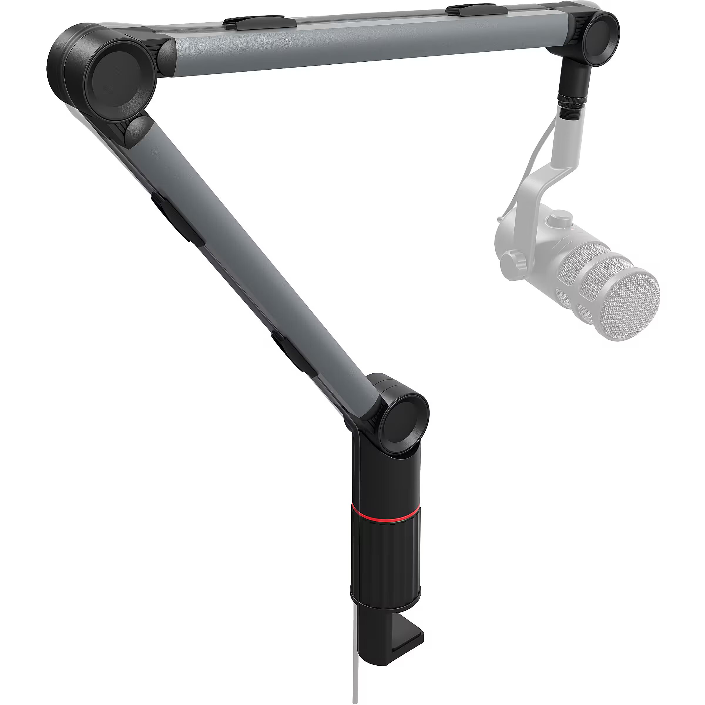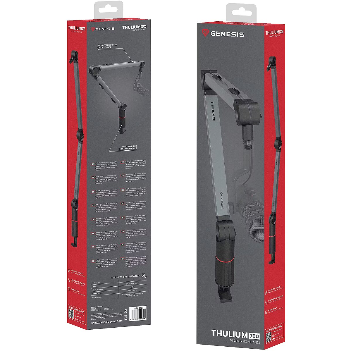 LongDesc - Discover the Thulium 700 - a professional microphone arm designed for the most demanding users. Compatible with 99% of microphones on the market, the Thulium 700 arm is the answer to the growing needs of gamers, streamers and content creators. Discover the Thulium 700 - a professional microphone arm designed for the most demanding users. Compatible with 99% of microphones on the market, the Thulium 700 arm is the answer to the growing needs of gamers, streamers and content creators. It offers exceptional robustness and stability, and its unique design allows it to work with microphones weighing up to 1 kg. Thanks to its adjustable tension force and greater folding angle than competing models, the Thulium 700 allows convenient mounting in a wide range of comfortable positions on the desk.ROBUST DESIGN FOR STABLE SUPPORTThe Thulium 700 features an extremely robust design, providing high stability even for large and heavy microphones and other audiovisual equipment, such as cameras and additional lighting. The sturdy design keeps the arm stable in its set position, which is crucial for professional recording without vibration or wobble. The relatively high minimum tension force reduces the risk of damaging equipment even with extreme tilting. RELIABLE MOUNTING ON VARIOUS SURFACESThe Thulium 700's advanced mounting system allows the arm to be attached very securely to a desk top 18-60 mm thick using the original clamp. Alternatively, for countertops 10-60 mm thick or with a beveled edge, a 10 mm diameter screw mount can be used, with the option to drill through the countertop. Both solutions provide unparalleled flexibility and installation security in any working environment.TENSION ADJUSTABLE TO MICROPHONE WEIGHTThe Thulium 700 arm is equipped with a tension adjustment system that allows you to easily adjust its position according to the weight of your microphone or other compatible device. To adjust the tension, simply tighten or loosen the screw hidden inside the base of the arm and adjust the 3 lock knobs of the desired position. Proper tension adjustment will ensure that subsequent position changes will not require tightening the knobs for the same device.DIFFERENT BENDING ANGLE FOR ELASTIC SETTINGThanks to its special design, the Thulium 700 arm allows a great deal of flexibility in terms of bending angles, and therefore easier adjustment of microphone positions, compared to other arms on the market. The lower part of the arm can be bent back by a maximum of 152°, while maintaining an angle of 55.5° between it and the upper part. This feature is extremely useful for gamers, streamers and content creators, allowing the accessory to be positioned close to the face while keeping the arm at the desired location in the recording frame. The maximum bending angles are illustrated in the graphic - it is worth noting that they may vary slightly depending on the set tension.ADAPTERS FOR VARIOUS MICROPHONESAND OTHER EQUIPMENTThe Thulium 700 kit includes a discrete blackened 3/8" to 5/8" adapter, allowing us to mount almost any microphone available on the market, including our flagship Radium 600 G2. In addition, the arm is equipped with a 1/4" photo thread adapter, so we are able to hook up a wide range of other audio-visual devices, such as cameras and camcorders, additional lighting, smartphone holders and more. Thanks to the matte black coloring, the adapters fit perfectly into the design of the arm and do not give unwanted reflections in recordings with strong light.ORGANIZATION OF CABLESTHANKS TO SPECIAL CLIPSThe Thulium 700 arm comes with up to two sets of interchangeable clamps for USB and XLR cables of 6 mm and 8 mm thickness, respectively. Each set includes 4 clamps, 2 for each of the long parts of the arm. With these, you can avoid cable slack (especially thinner USB cables) and maintain perfect order and aesthetics in your workspace, which is especially important in professional recording environments.ELEGANT AND ATTRACTIVE FINISHThe Thulium 700 arm is finished in gaming colors of black, red and gun metal, which translates into a universally appealing look on streams and videos. With a sleek finish and consistent design to match our Toron 531 headphones, the Thulium 700 creates a stylish and professional gaming headset whose upscale look fully reflects its build quality.