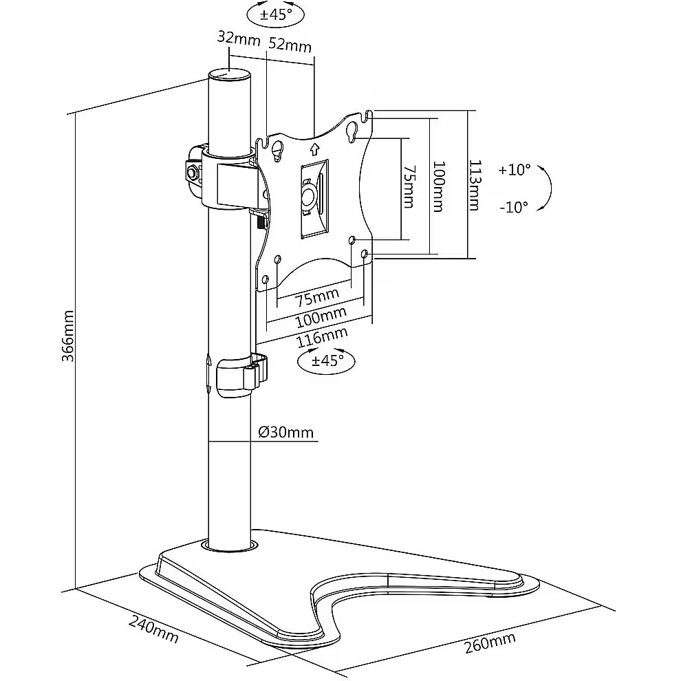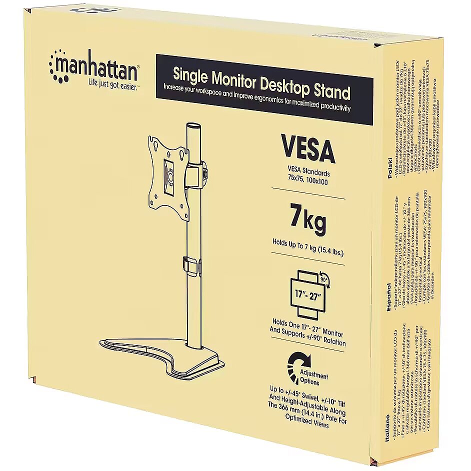 LongSummaryDescription - Manhattan Desk Mount for TV & Monitors, Stand Assembly, Tilt/Swivel/Rotation, For screens 10" to 27", VESA compatability: 75x75 and 100x100mm - check the dimensions of the four mounting holes on back of screen to ensure it fits, Max 7kg, Black, Bracket. Mounting: Freestanding, Maximum weight capacity: 7 kg, Minimum screen size: 43.2 cm (17"), Maximum screen size: 68.6 cm (27"), Minimum VESA mount: 75 x 75 mm, Maximum VESA mount: 100 x 100 mm. Height adjustment, Swivel angle range: -45 - 45°, Tilt angle range: -10 - 10°. Product colour: Black