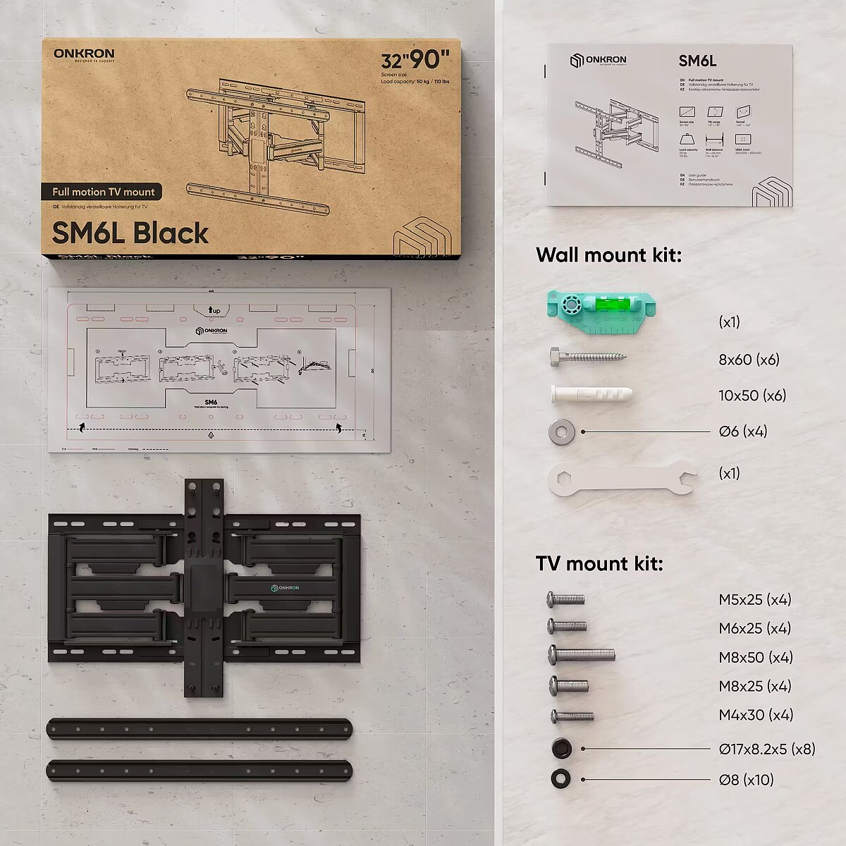 Summary - ONKRON SM6L-B. Maximum weight capacity: 50 kg, Minimum screen size: 81.3 cm (32"), Maximum screen size: 2.29 m (90"), Minimum VESA mount: 200 x 200 mm, Maximum VESA mount: 600 x 400 mm. Tilt angle range: -10 - 5°, Angle of rotation: 45°, Distance to the wall (min): 3.4 cm, Distance to the wall (max): 41.5 cm. Product colour: Black
