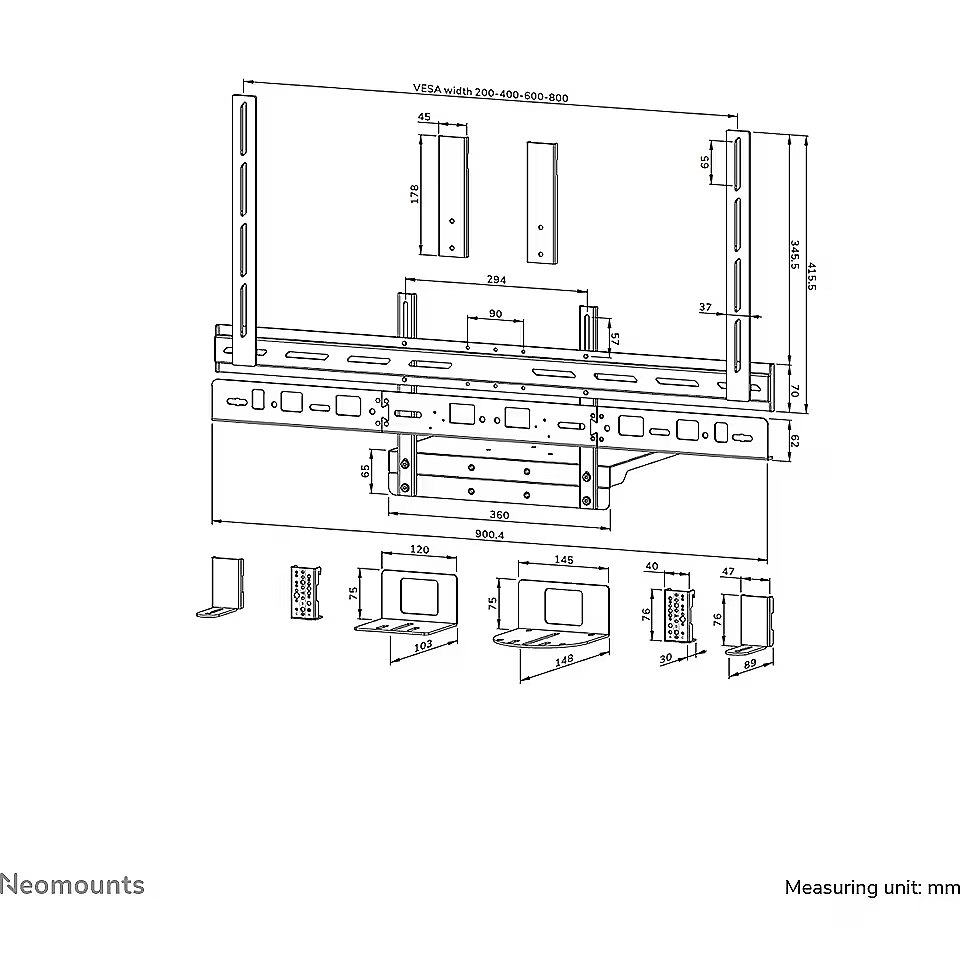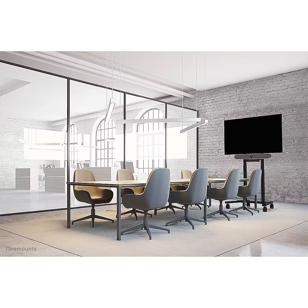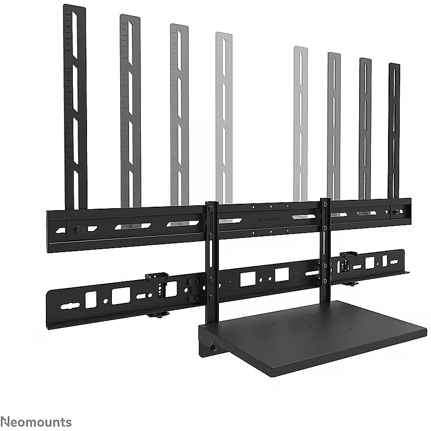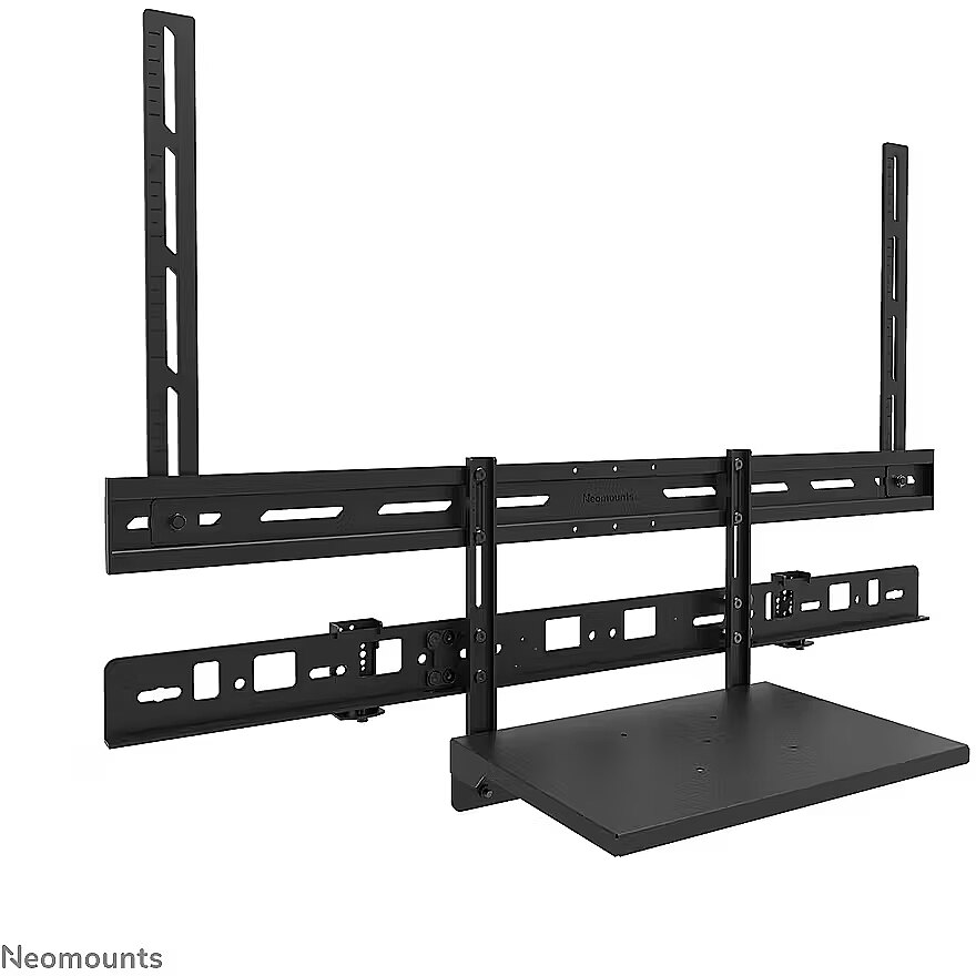 LongDesc - The Neomounts AV60-500BL is a universal videobar and laptop shelf kit designed for 43" displays and larger, supporting VESA hole patterns from 200x200 up to 800x600 mm. Built for durability and versatility, the kit supports devices up to 8 kg and can be installed either above or below the screen. The included laptop shelf carries up to 2,5 kg providing a smart solution for laptops, notebooks, tablets or extra equipment. Both the videobar/laptop support and the backplate brackets are height-adjustable, offering maximum flexibility.Compatible with most* videobars, PTZ cameras, and soundbars, including Logitech Rally speakers, the AV60-500BL ensures broad applicability. The mounting holes allow width and height variation, while the VESA frame adjusts in both height and width (200/400/600/800). The kit is compatible with both wall and floor mounts. Despite its versatility, installation is straightforward, aided by ruler-guided alignment for a seamless fit.* The AV60-500BL is truly universal, compatible with any videobar that fits within the bracket?s range (see line drawing). It is also specially designed for the following models:- Bose Professional VB1 and VB-S- Neat Bar (gen 1) and Bar Pro- Poly Studio USB, Studio R30/X30/X32, Studio X50/X52/V52, Studio X70/X72/V72 and Studio V12- Jabra Panacast 40/50- Logitech Meetup, Meetup 2, Rally Bar, Rally Bar Mini, Rally Bar Huddle and Rally Plus- Cisco Webex Room Kit Plus- Yealink MSpeaker II, MeetingBar A30/A40/A50, UVC20/UVC30 Room/UVC34/UVC40 and MeetingEye 400/600- AVer VB350 and VB370A- Barco ClickShare Bar (Pro)- Maxhub Xbar U50/V50/W70 and UC S05/S07/S10/S10 Pro/S15- Predia Connect Camera- Biamp Parlé ABC 2500(a), VBC 2500(a)/2800 and SBC 2- Lenovo ThinkSmart OneFor detailed compatibility with specific models or mounting sizes, please refer to the online manual.