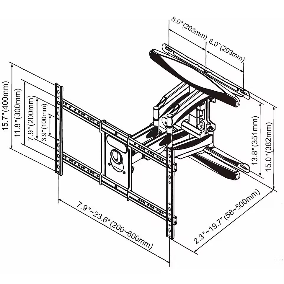 Description - R-98 ART LCD/LED TV Mount for 40-75" 45KG TVs, vertical/horizontal adjustment: 58-500mm: - VESA standard: 200x200-600x400 - Maximum TV weight: 45kg - Maximum mounting hole spacing: 600x400 - Vertical adjustment (tilt): -5 to 8 degrees - Horizontal adjustment (rotate): 160 degrees - Distance from the wall: 58-500mm - Includes a cable management system - A lock prevents the TV from sliding - An extensive mounting point cover system - A system for improving TV leveling by +/-3 degrees (Rotation) - The cable management system allows for effective cable management and protection against potential crushing