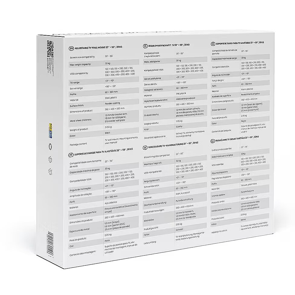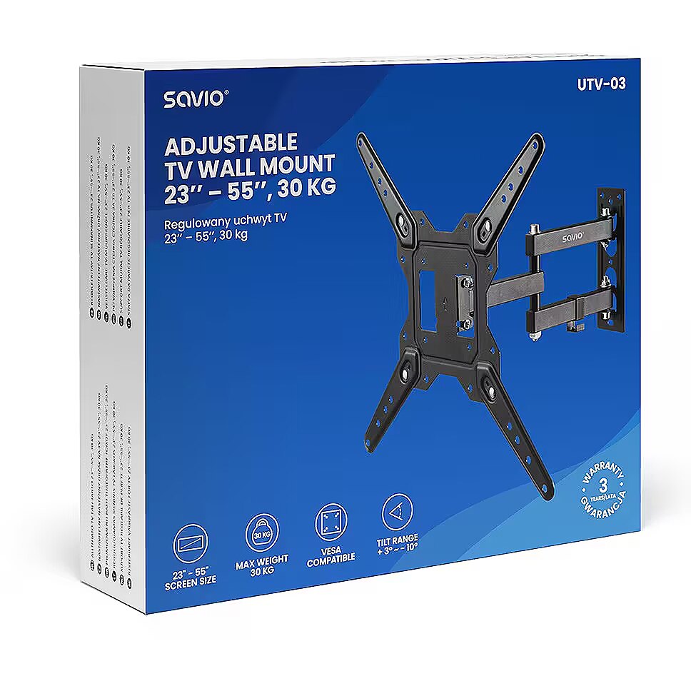 Description - Adjustable TV wall mount 23-55" 30 kg UTV-03 Change the way you watch TV and reclaim space in your room with the adjustable UTV-03 TV wall mount. This advanced solution combines a durable steel construction with full adjustability, ensuring the safety of your equipment and the highest level of comfort. Whether youre mounting a TV in the bedroom, living room, or office, this mount adapts to your needs. Screen Size: 2355 Looking for a universal solution that works for both smaller monitors and medium-sized TVs? The UTV-03 model was designed with a wide range of devices in mind. Its a perfect fit for displays from 23 to 55 inches. Its an excellent choice if you plan to upgrade to a larger TV in the future the mount grows with your needs, ensuring stability for both compact screens and larger home entertainment setups. VESA Compatibility Theres no need to worry about whether the mount will fit your TV. Our product fully supports the VESA (Video Electronics Standards Association) standard a worldwide specification defining the spacing of mounting holes on the back of your TV. The mount supports a wide range of hole patterns, from 100 × 100 mm up to 400 × 400 mm. This gives you confidence that installation will be quick and trouble-free, regardless of your devices brand. Maximum Load Capacity: 30 kg The safety of your equipment is our top priority. The UTV-03 mount features a solid steel structure that easily supports loads of up to 30 kg. We use high-quality steel of varying thickness to ensure exceptional durability: 2.5 mm for the base mounted directly to the wall (the foundation of stability), 1.8 mm for the VESA panel, 1.2 mm for the mounts arms. The entire mount is finished with a powder-coated surface, protecting it from corrosion and scratches. By choosing this model, you gain peace of mind knowing your TV is securely mounted. Tilt Range: +3° ~ -10° Watch your favorite movies and shows in the most comfortable position. The mount offers wide tilt adjustment options: Tilt down (-10°): Ideal when the TV is mounted slightly higher, allowing you to angle the screen toward your eyes and reduce neck strain. Tilt up (+3°): Makes it easier to access ports and cables on the back of the device. But thats not all. The long arm allows you to adjust the distance from the wall between 60 mm and 382 mm, as well as rotate the screen 90° to the left or right. This helps eliminate bothersome light reflections and ensures a perfect viewing angle from anywhere in the room whether youre on the couch or in the kitchen area. Package Contents The set includes everything you need for immediate installation: Durable UTV-03 TV mount in black. Complete set of mounting accessories (screws, plugs). A clear user manual guiding you step by step through the installation process.