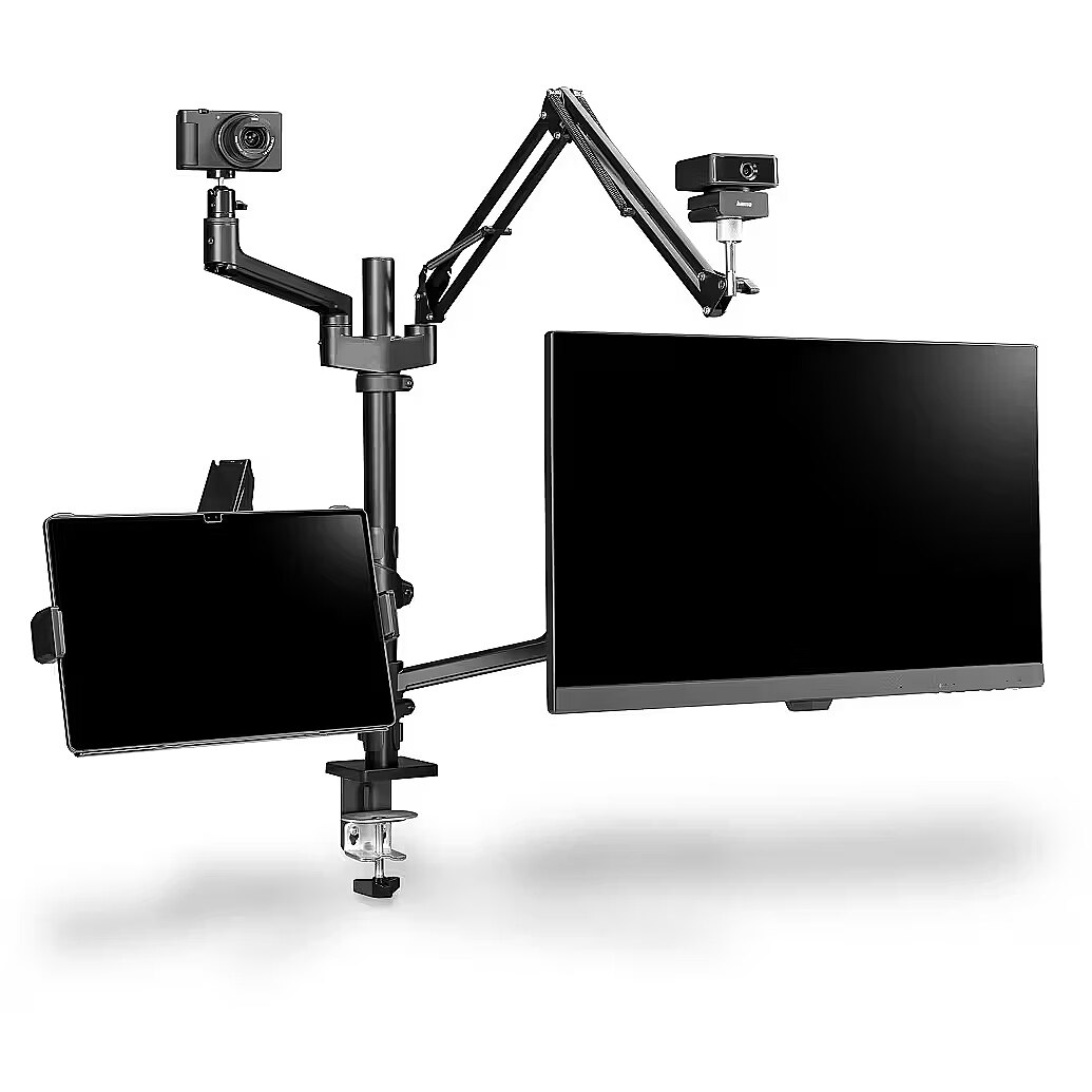 LongDesc - The demands of streaming, gaming and everyday office life combined in just one monitor mount. Ergonomic, functional and tidy - this is how desk work is done today!Better ergonomics at your workstation and while streamingAfter the last streaming session or the hour-long call you just finished, does your head hurt, your neck feel stiff and your back also ache? Then it's high time for an ergonomic workstation. And while most people think of a suitable office or gaming chair, they quickly forget that the correct positioning of equipment such as monitor, laptop, streaming light and camera also ensures a sitting posture that is easy on the neck and back. It's a good thing that the monitor holder for your streaming setup adapts to your individual needs with no fewer than four height-adjustable arms . So you can quickly and easily retrofit your desk ergonomically and are perfectly equipped for more hours at the PC or laptop.Monitor holder for streaming setup and officeDo you want to interact with your followers in the livestream studio or record the latest episode of your own podcast? Or are you more into Twitch and want to live stream the latest gaming session? Are you a vlogger and need a new reel or even a longer video for YouTube or Instagram? Or do you work in a classic office or home office and simply want to ensure better ergonomics at your computer workstation? With this universal mount, no wishes remain unfulfilled, thanks also to the included accessories.Microphone arm, monitor arm, tablet holder and moreOne or two monitors, tablet or micro, light or camera - the requirements for your workstation can change at any time. So simply rebuild the streaming arm as you need it!One for allPerfect for the next streaming or gaming session: whether webcam, microphone, smartphone or tablet, ring light or camera, monitor or laptop, there is room for a lot of streaming equipment on the four arms, making it ideal for bloggers, streamers, gamers and so onFully mobile monitor holderFor an ergonomic workstation: the streaming arm adapts to your personal requirements and posture. Whether you need stepless height adjustability, swivel and tilt functions, pull-out capability or portrait or landscape formats, this is how ergonomics works in the office and home office while gaming2 monitors up to 32 inches and 8 kilogramsSpace for two monitors: the monitor arms be used for all common screen sizes with a diagonal of 33 - 81 cm (13 - 32") and up to a weight of 8 kg per armTripod ball headUnusual recording angle: Streaming light or camera can be rotated and tilted thanks to tripod ball head - for the perfect streaming setupPortrait and landscape formatAlways the perfect recording position: Portrait and landscape format thanks to swivelling smartphone and tablet holderIntegrated cable managementFor tidy workstations: Cable management guides the monitor cable tidily behind the screen, avoiding cable spaghetti and saving space. The cable guide also protects the cable against breakage thanks to strain reliefSimple assemblyFast and straightforward desktop installation: The monitor holder is attached to the desk in an instant with the clamping screw. VESA makes installing the screen easier - first put the VESA plate on the monitor, then hook it in the screen holder, and you're done