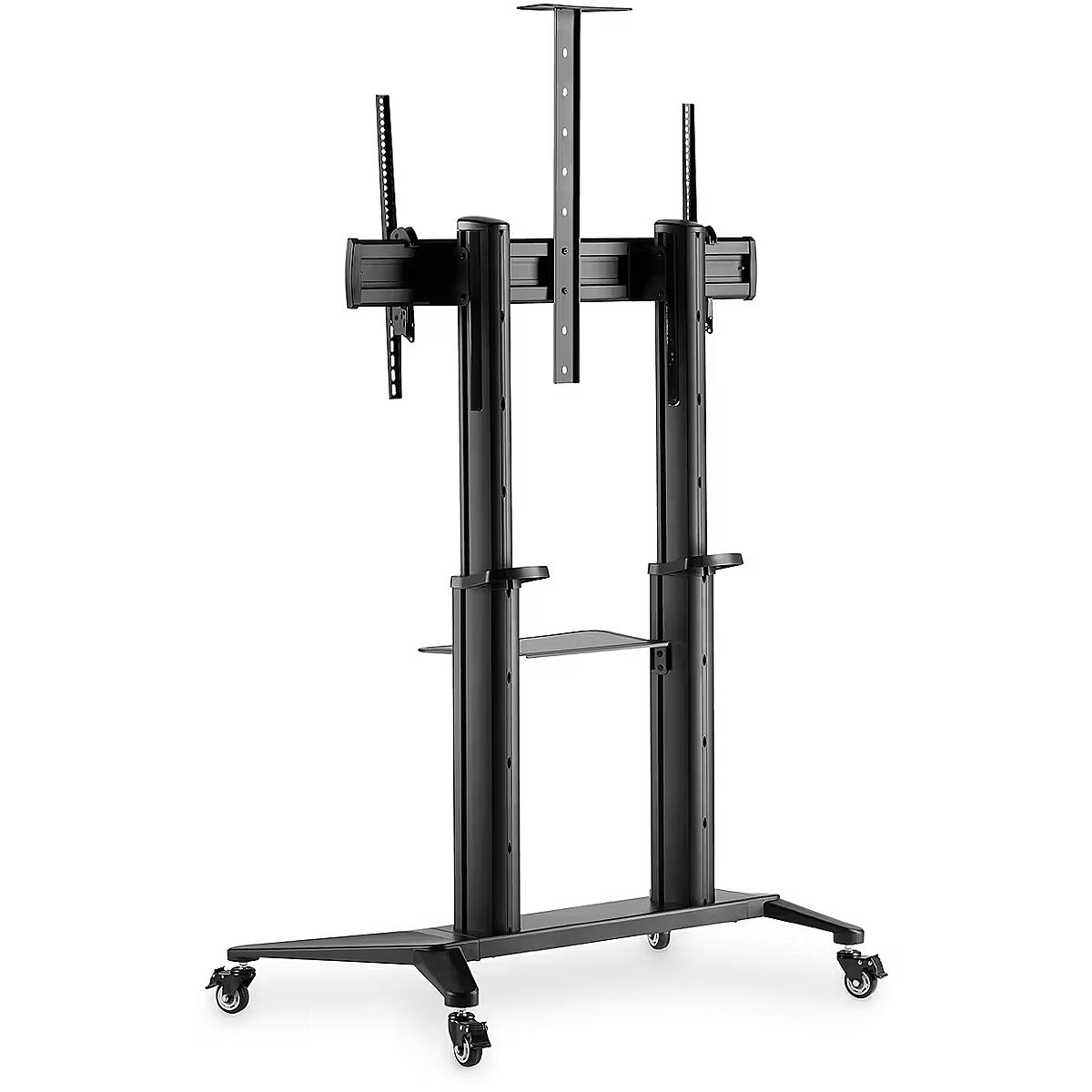 Description - The TV Presentation Trolley offers a sturdy and durable support for 70" to 120" monitors, with a maximum load capacity of 140 kg. In addition, the trolley has a height-adjustable camera mount and a shelf for notebooks, media players, etc. The trolley is flexibly positionable and has a built-in cable channel and practical handles on the back. The structure is made of extremely strong and lightweight aluminum, steel and plastic. An ideal solution for conference rooms, training rooms, exhibition halls and other applications at various events. Holder for mounting displays from 70 - 120'', maximum load 140 kg Height adjustment of the display holder: min. 125 cm - max. 160 cm Display holder tilt range: +5° to -10° Height-adjustable camera holder - maximum load 5 kg Height-adjustable shelf for a notebook, player or other devices - maximum load 10 kg Convenient handles on the back for quick and easy relocation/positioning Characterized by high load capacity castors with a locking mechanism Integrated cable management system Extremely strong and lightweight construction made of aluminum, steel and plastic