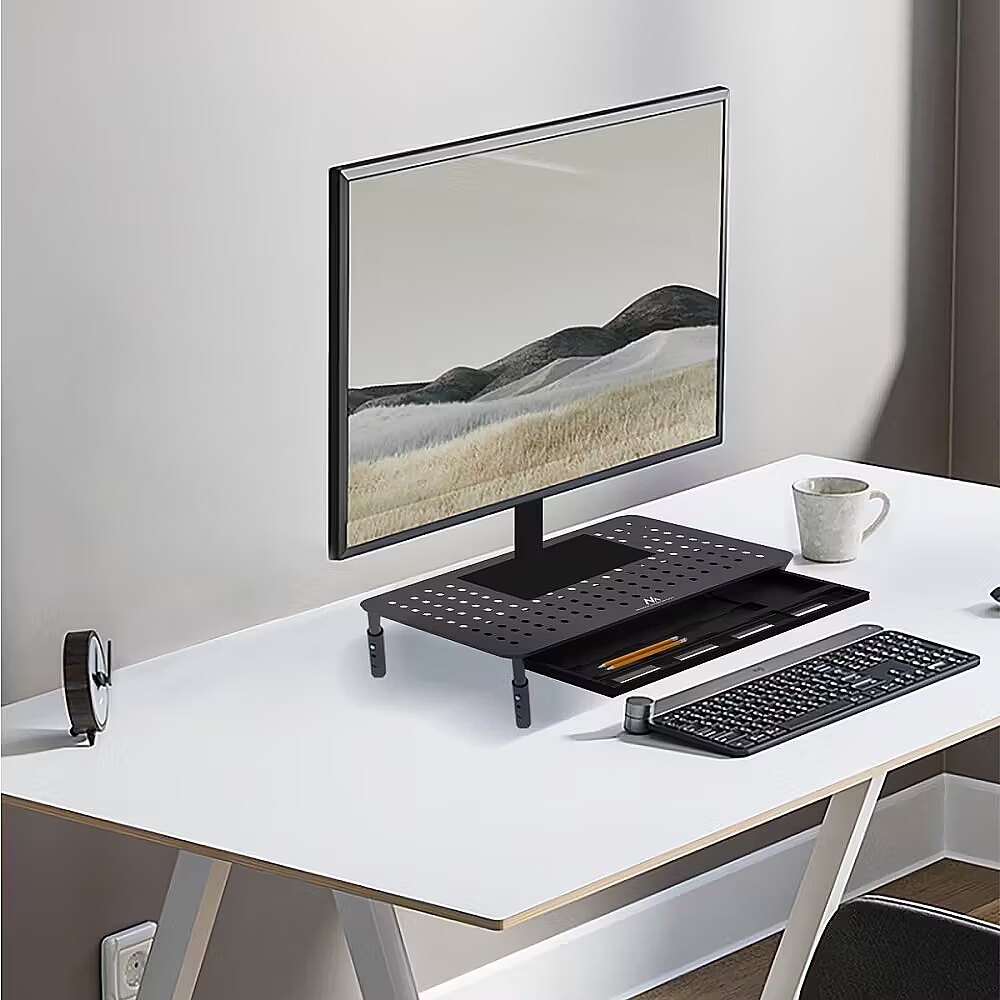 Optimize your workspace with our versatile Monitor and Laptop Stand featuring a convenient drawer, designed for comfort and productivity. Compatible with monitors from 13 to 32 inches and supporting up to 20 kg, it seamlessly integrates into any office setup. Promoting proper posture and reducing muscle tension, our stand ensures ergonomic bliss during long computer sessions. Crafted from premium materials for durability, it supports various electronic devices, including printers and scanners, up to 20 kg. Enjoy superior ventilation with its perforated surface, preventing overheating and maintaining optimal working conditions. Elevate your workspace confidently with our robust design, safeguarding your devices while enhancing productivity.