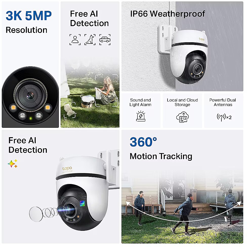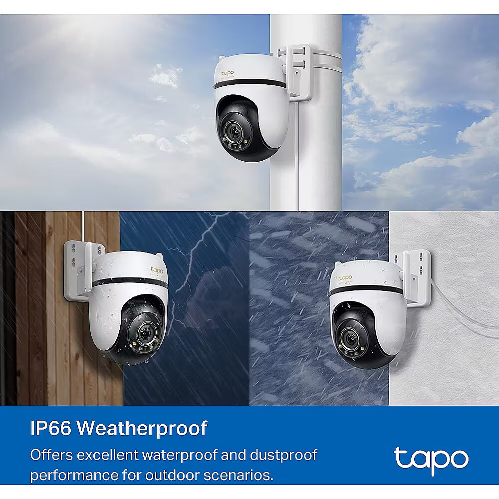 LongDesc - Power Your 360° Vision with 3K ClarityOutdoor Pan/Tilt Security Wi-Fi CameraCapture Every Detail, Day and NightWith 3K resolution, Tapo C530WS offers enhanced video quality better than 1080P.Enjoy colorful images in low-light conditions at night with built-in spotlights and a starlight sensor. With smart mode, the live view turns from black and white to color after detecting person.AI Detection for More Relevant NotificationsSmart AI accurately identifies people, pets, and vehicles and detects tampering and line crossing. It sends instant notifications when specific objects are detected, ensuring you receive timely and precise alerts.Long-Range Uninterrupted ConnectivityDual high-performance external antennas extend wireless coverage up to 492 ft in open areas. You can also connect your camera to the network through the Ethernet port for a stable connection.Designed to Withstand Extreme ConditionsWith IP66 weatherproofing, Tapo C530WS offers excellent waterproof and dustproof performance for outdoor scenarios. It works well in rain, dust, and heat, operating reliably in different environments.Custom Sound and Light AlarmCustomize your own audio alarm to frighten away unwanted visitors. Adjust two built-in spotlights for fine-tuned illumination.24/7 Secure Local & Cloud StorageSave crucial moments to a microSD card† (up to 512 GB) or subscribe to Tapo Care for cloud storage‡ after a 30-day free trial, ensuring you never lose important footage.Multiple Installation OptionsUse the mounting screws, template, and loops△ to install on any wall, ceiling, or pole for the perfect view—wherever you want.Customizable Activity ZoneCustomize detection zones to receive alerts for your most important areas.Two-Way AudioCommunicate directly with the outdoors for your convenience.Physical Privacy ModeMaintains your privacy with the lens physically blocked by the housing.