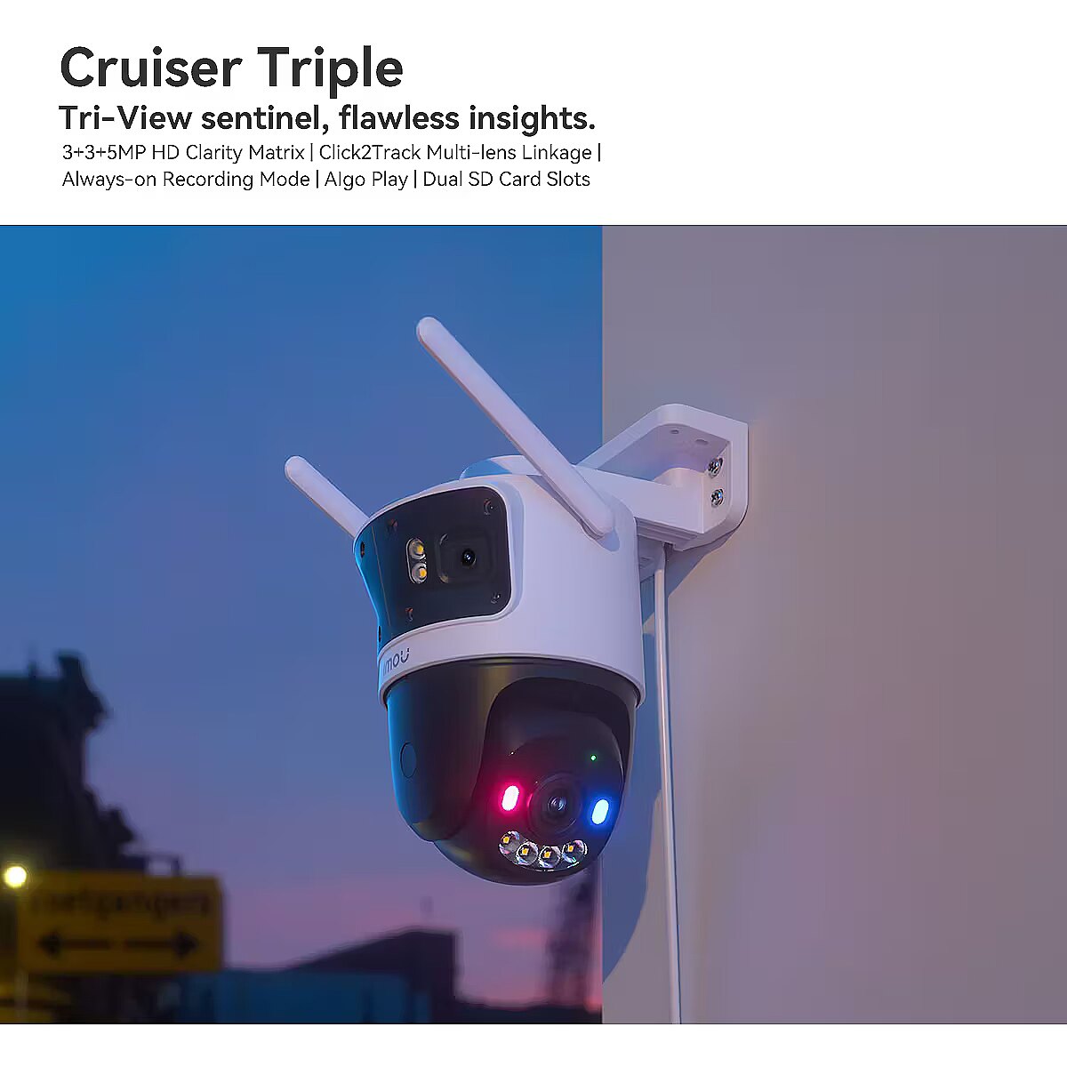 description_en - Tri-View sentinel, flawless insights 3+3+5MP HD Clarity Matrix Click2Track Multi-lens Linkage Always-on Recording Mode AIgo Play Dual SD Card Slots Tri-View sentinel surveillance