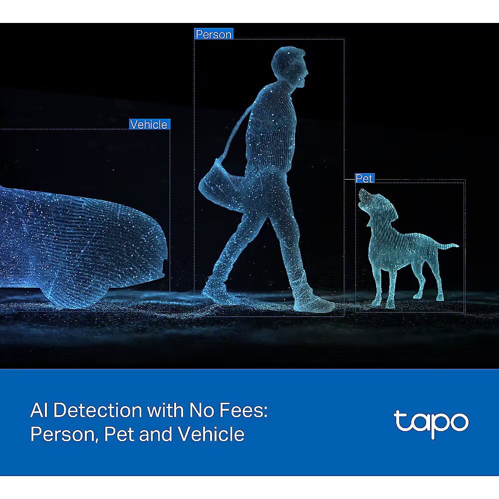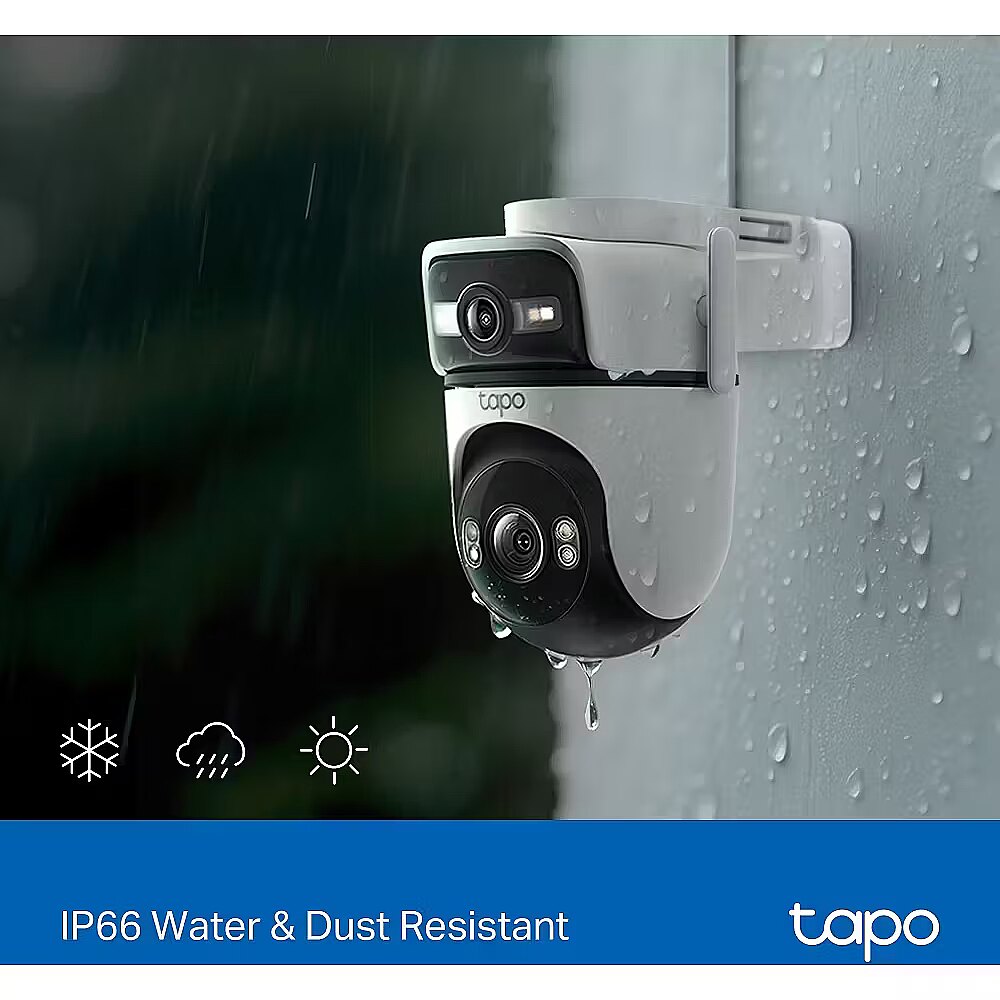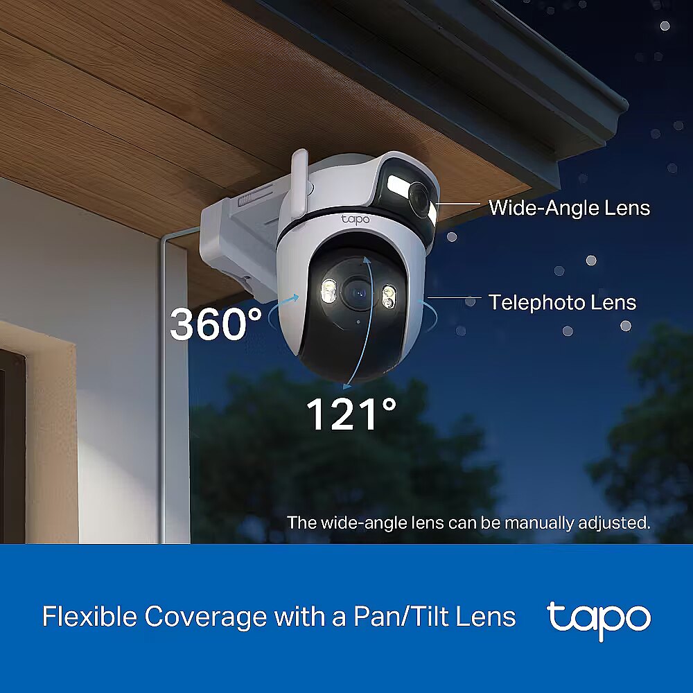 Tapo C545D can be securely mounted on a wall, affixed to the celling, or even held by a rod - designed to withstand the elements and deliver dependable monitoring across diverse outdoor settings.2K 3MP Dual Lens - Capture the full picture with dual 2K high definition optics, monitoring two separate areas at the same time with just one device. Engineered to minimize blind spots for optimal coverageWide-Angle & Telephoto Lens - With 165° FOV wide-angle lens and 6mm telephoto lens, it ensures all-around awareness and down-to-the-detail protection of your homeSynchronized Smart Tracking - When the fixed lens detects events, the pan/tilt lens will automatically pivot to focus on and track the moving objectOne-Tap Smart Focus - Select an area in the wide-angle view, and the pan/tilt camera will focus on it instantlyIP66 Weather Resistance - Delivers reliable surveillance through rain, snow, dust, and scorching heat. Monitor your property with confidence, no matter the weatherEthernet Support - Ideal for areas with weak Wi-Fi, an Ethernet connection guarantees smooth live streaming and faster data transmissionFree AI Detection & Notification - Get instant push notifications when motion, person, pets and vehicles are detected, there is no additional fee to use itWorks with Alexa, Google Home & Samsung SmartThings - Fully compatible with Amazon Alexa, Google Assistant and Samsung SmartThingsSmart Night Vision -Choose from vibrant full-color with spotlights, discreet black-and-white infrared, or an automatic Smart Mode based on Al light detection for optimal clarity in any nighttime scenarioSecure Local or Cloud Storage - Save footage continuously on up to a 512 GB microSD card (not included) or subscribe to Tapo Care for cloud storage which saves 30-day video2-Way Audio - Engage in seamless, real-time conversations with our two-way audio feature, designed for minimal latency and exceptional sound clarity