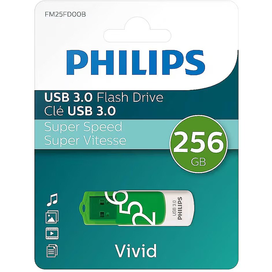 LongSummaryDescription - Philips FM25FD00B/00. Capacity: 256 GB, Device interface: USB Type-A, USB version: 3.2 Gen 1 (3.1 Gen 1). Form factor: Swivel. Weight: 8 g. Product colour: Green, White