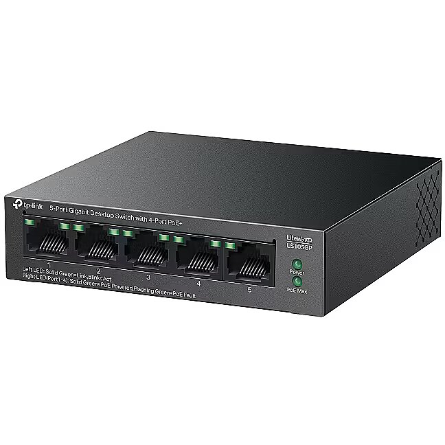 The TP-Link LiteWave Series PoE Switches require no configuration and provide PoE (Power over Ethernet) ports. They can automatically detect and supply power with all IEEE 802.3af/at compliant Powered Devices (PDs). In this situation, the electrical power is transmitted along with data in one single cable allowing you to expand your network to where there are no power lines or outlets, where you wish to fix devices such as APs, IP Cameras or IP Phones, etc.Full Gigabit Ports: Five gigabit augo-negotiation ports provide up to 10 Gbps switching capacity65 W PoE Budget: Four gigabit 802.3af/at-compliant PoE+ ports easily connect and power fixed devices like IP cameras, access points, and IP phones via a single cable. Up to 30 W PoE output is supported by each PoE port.*Up to 250 m PoE Transmission: With Extend Mode, PoE transmission distance reaches up to 250m, perfect for surveillance camera deployment in large areas.**PoE Auto Recovery: Automatically reboots your dropped or unresponsive PoE-powered devicesPlug and Play: Simply plug and play for instant connectivity with no configuration requiredSilent Operation: Fanless design reduces power consumption and ensures silent operation, ideal for noise-sensitive homes or businessesReliable Hardware Design: Durable metal casing and desktop/wall-mounting design are well-suited for different environments