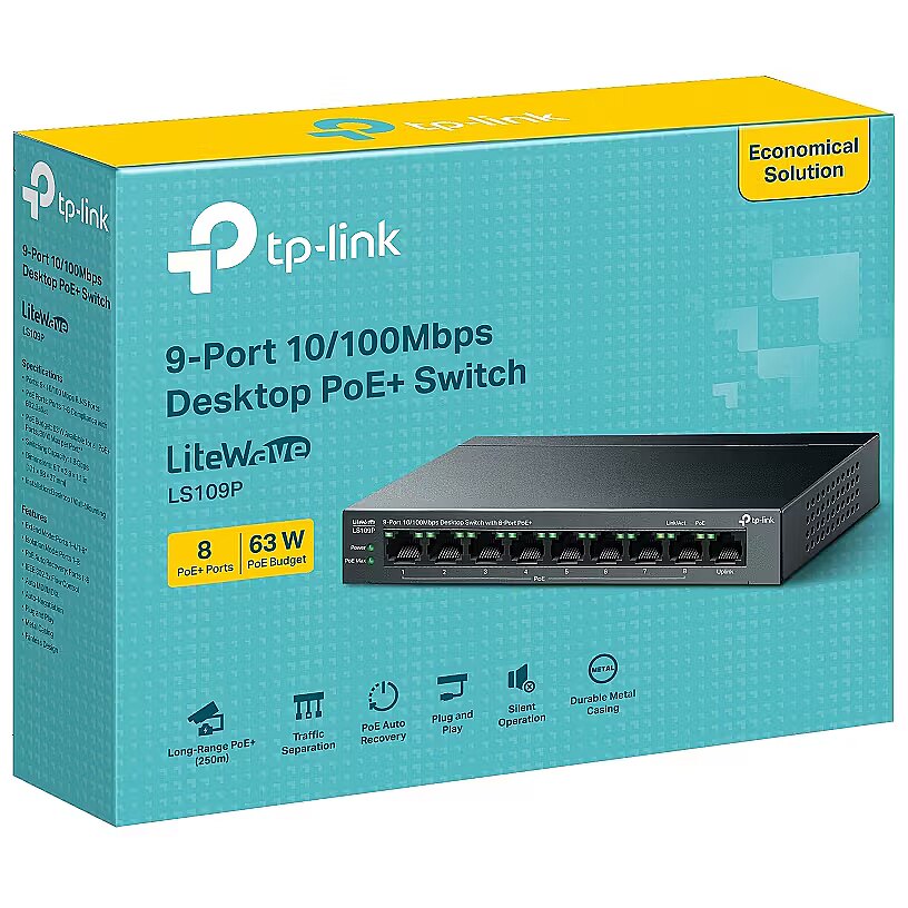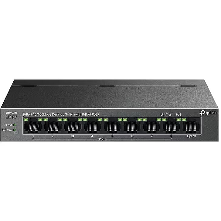 Description - TP-LINK LS109P 9-Port 10/100Mbps Desktop Switch with 8-Port PoE+ 63 W PoE Budget: Eight 10/100 Mbps 802.3af/at-compliant PoE ports easily connect and power fixed devices like IP cameras, access points, and IP phones via a single cable. Up to 30 W PoE output is supported by each PoE port. Up to 250 m PoE Transmission: With Extend Mode, PoE transmission distance reaches up to 250m, perfect for surveillance camera deployment in large areas. PoE Auto Recovery: Automatically reboots your dropped or unresponsive PoE-powered devices. Traffic Separation for Higher Security: Isolation Mode allows one-click client traffic separation to avoid snooping and tampering, and isolate broadcast storms. Plug and Play: Simply plug and play for instant connectivity with no configuration required. Silent Operation: Fanless design reduces power consumption and ensures silent operation, ideal for noise-sensitive homes or businesses. Reliable Hardware Design: Durable metal casing and desktop/wall-mounting design are well-suited for different environments.