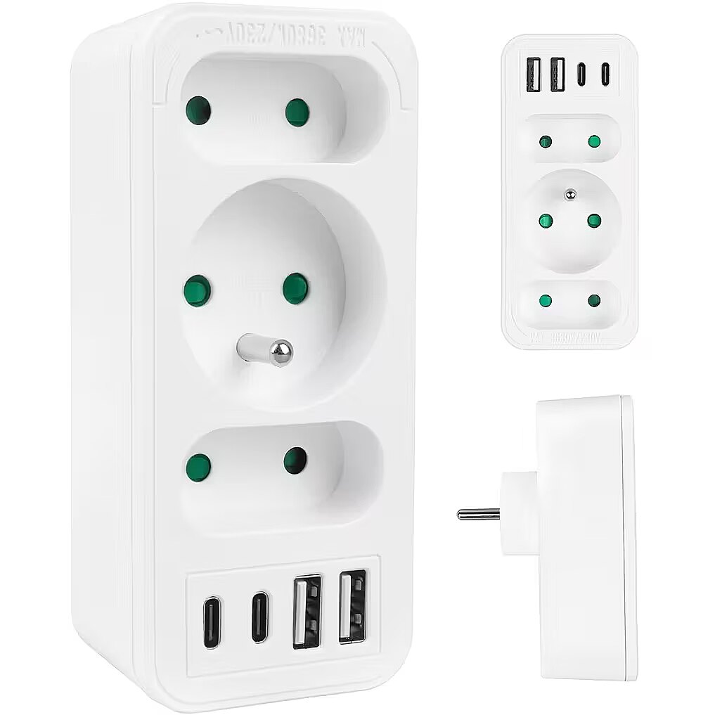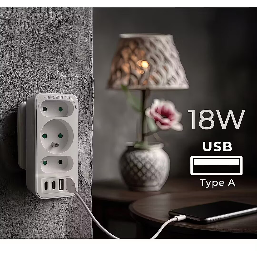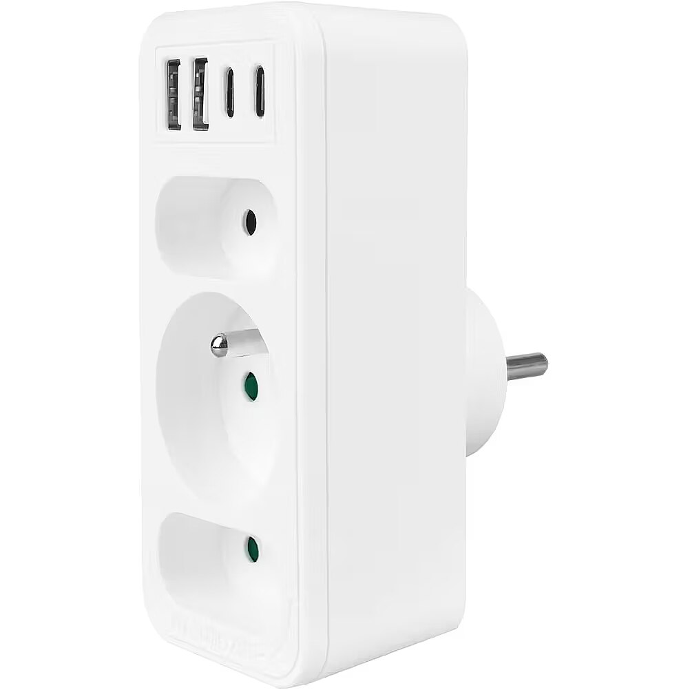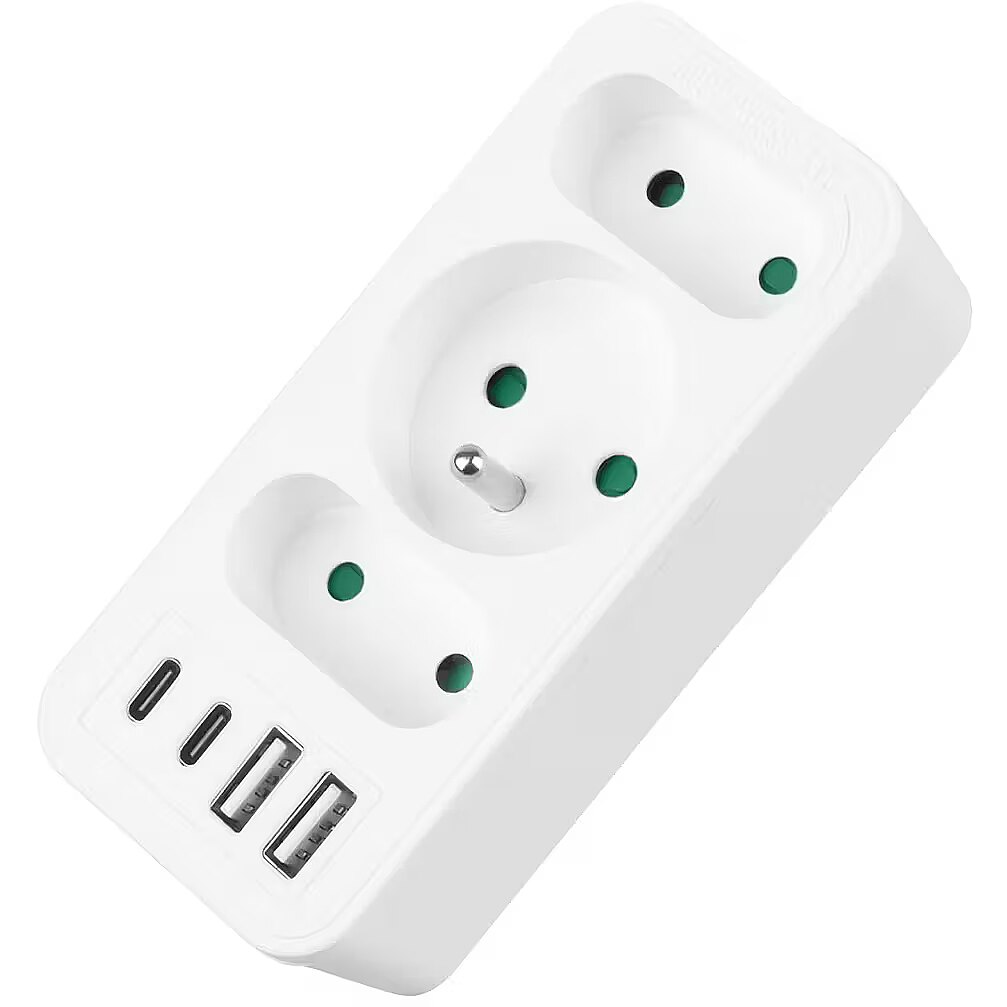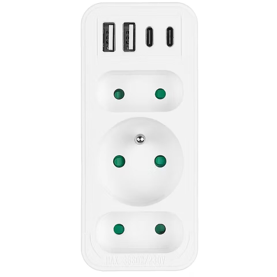 Other features - Color: white Housing material: plastic Power source (voltage): 110-240 V AC / 50/60 Hz Type of sockets: 2x flat socket (type C), 1x round socket with grounding pin (type E) Maximum load: C sockets - max. current 6A 1380 W; E socket - max. current 16A 3680W USB port type: 2x USB-A, 2x USB-C USB-A output power: 5V/3A, 9V/2A, 12V/1.5A, max. 18 W (using one output) USB-C output power: 5V/3A, 9V/2.22A, 12V/1.67A, max. 20 W (using one output)  Child safety: yes - Protection rating: IP20