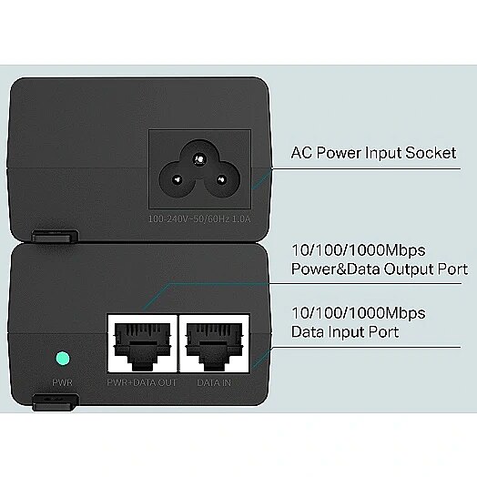 TP-LINK PoE+ Injector Adapter TL-POE160S Ethernet LAN (RJ-45) ports 1x10/100/1000Mbps RJ45 data-in port, 1x10/100/1000Mbps RJ45 power and data-out port