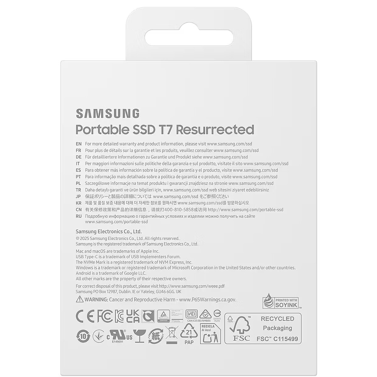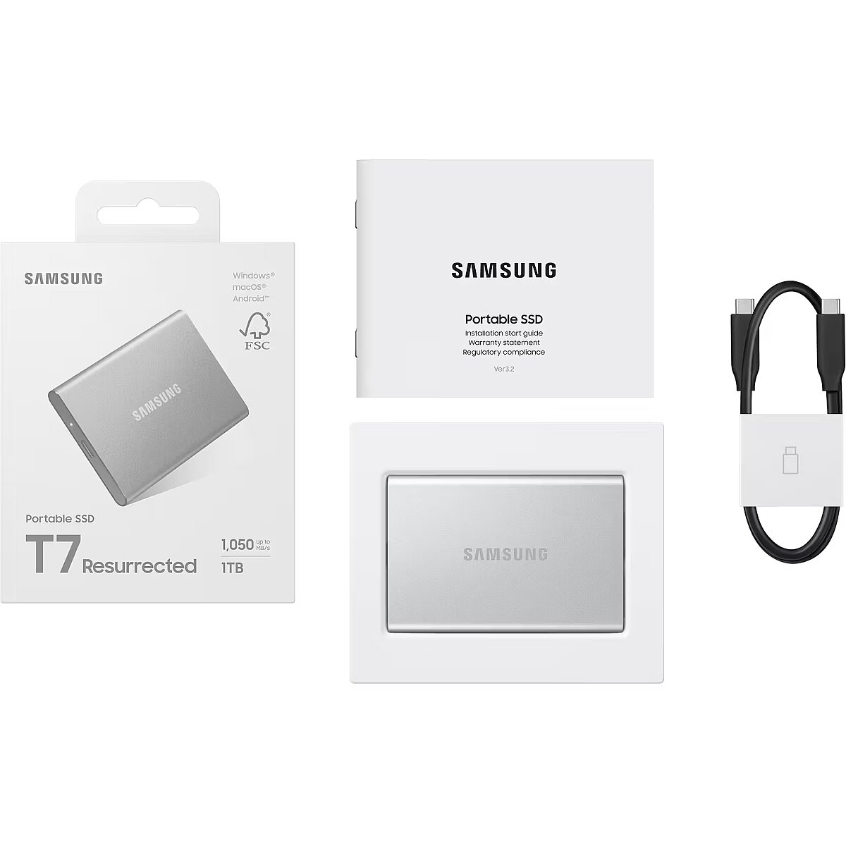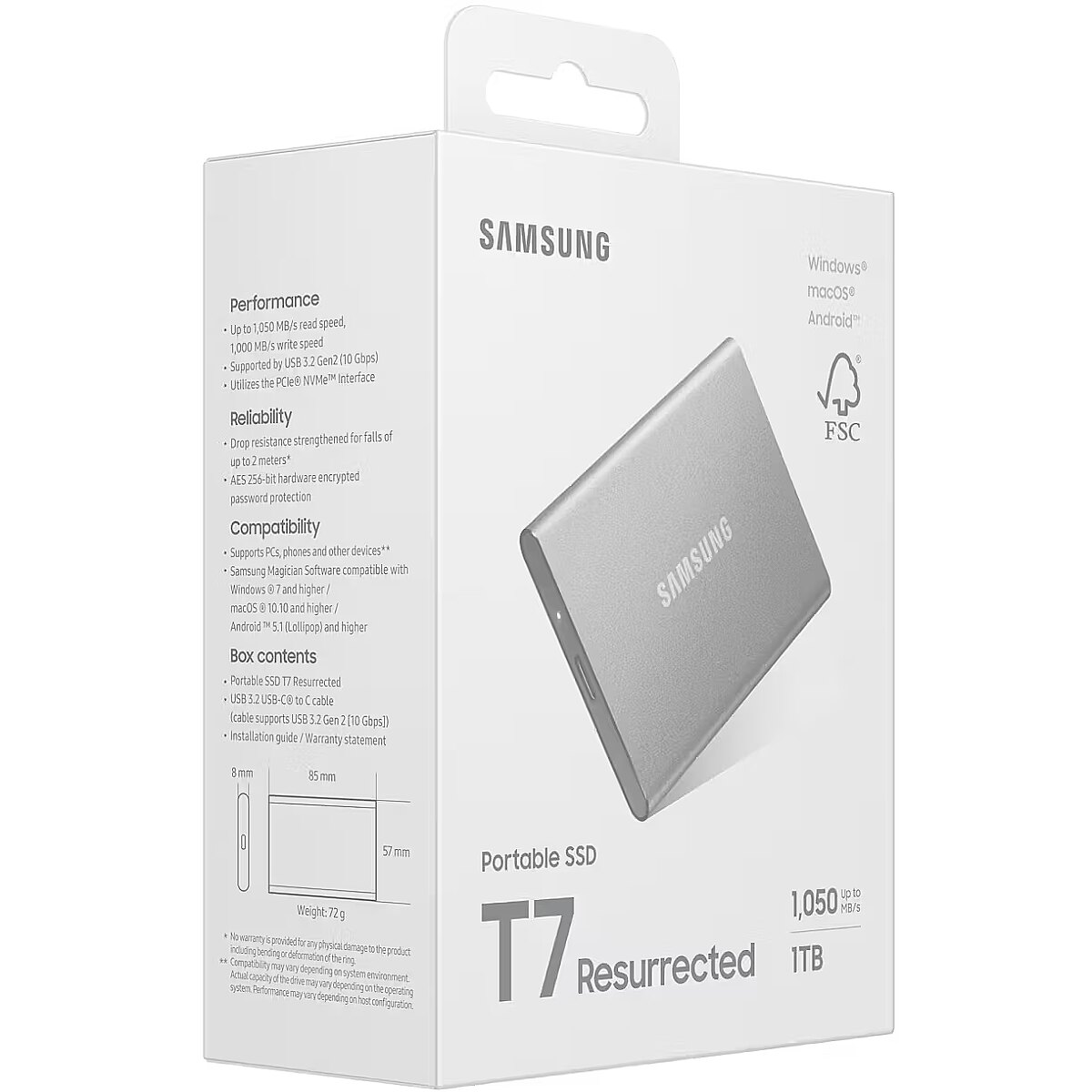 LongDescription EN - Sustainable design with purposeThe T7 Resurrected is built around the idea of giving new life to overlooked materials. Its recycled aluminium enclosure combines durability, refined aesthetics and a responsible approach to sustainability without compromising on a premium feel. Speed that elevates work and playWith sequential read and write speeds of up to 1,050 MB/s and 1,000 MB/s, this portable SSD transfers large files in seconds. It is ideal for storing and working with photos, videos, games and professional projects. Wide compatibility for everyday freedomThe T7 Resurrected works seamlessly with Windows and macOS computers, smartphones, tablets and gaming consoles. The included USB-C to USB-C cable ensures fast and convenient connectivity out of the box. Security and control with Samsung MagicianSamsung Magician software allows you to monitor drive health, protect valuable data, optimise performance and install the latest firmware updates with ease. Peace of mind for what matters mostDesigned to safeguard your most important files, the T7 Resurrected delivers dependable performance and confidence when your data truly matters.