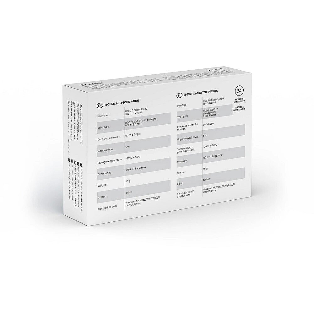 Other features - Interface: USB 3.0 SuperSpeed (up to 5 Gbps) Drive type: HDD / SSD 2.5 with a height of 7 or 9.5 mm Data transfer rate up to 5 Gbps Input voltage: 5 V Storage temperature: -20C 50C Dimensions: 120.5 × 75 × 13 mm Weight: 45 g Colour: black Compatible with: Windows XP / Vista / 7 / 8 / 10 / 11, MacOS, Linux