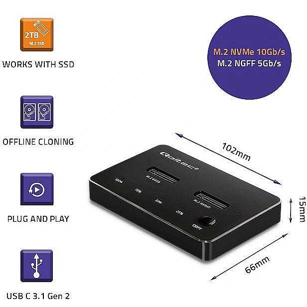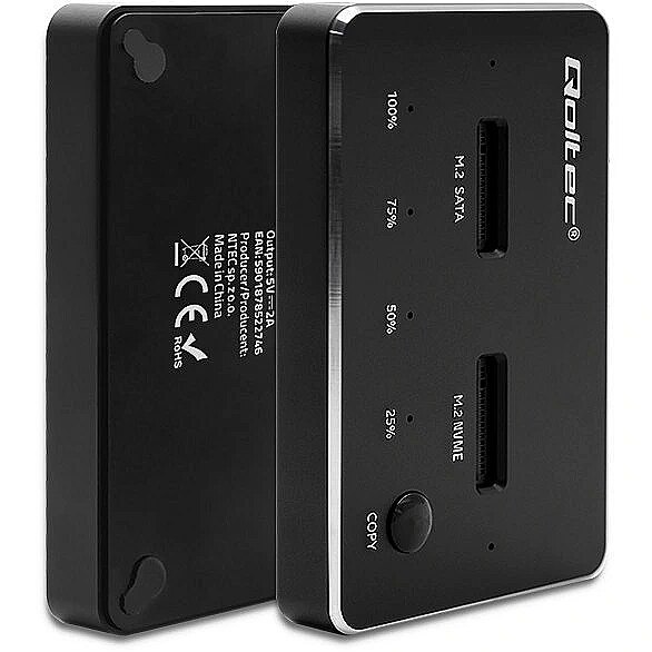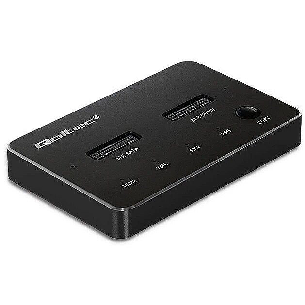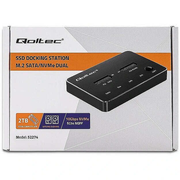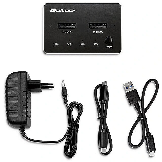 The station is compatible with M.2 drives with SATA and NVMe interfaces. It offers data transfer rates of up to 10 Gbps. In addition, the disk station from Qoltec is a device: Suitable for M-Key and B&M-Key NGFF SSDs with sizes: 2230, 2242, 2260, 2280, 22110, Support of the UASP standard, allows several commands to be executed at the same time, USB 3.1 Gen2 interface enables data transfer at a speed of 10 Gb/s, The device is compatible with USB 3.1 Gen1 and USB 2.0, Good stability of the device thanks to non-slip pads, LED indicates copy status (25%, 50%, 75%, 100%), Single M.2 drive supports up to 2TB, total capacity 4TB, Useful when there is no other way to connect an SSD, No need to install drivers, simply plug into a USB port and use thanks to the simplicity of the Plug&Play function. High-speed data transfer, two options for copying data
