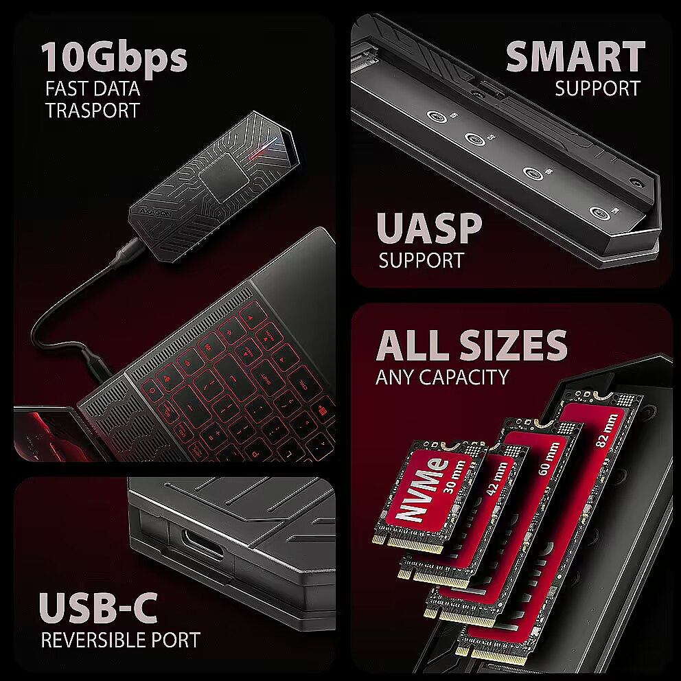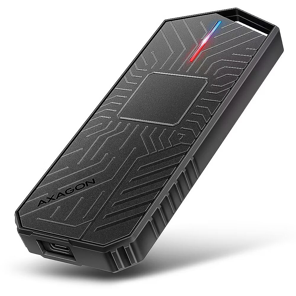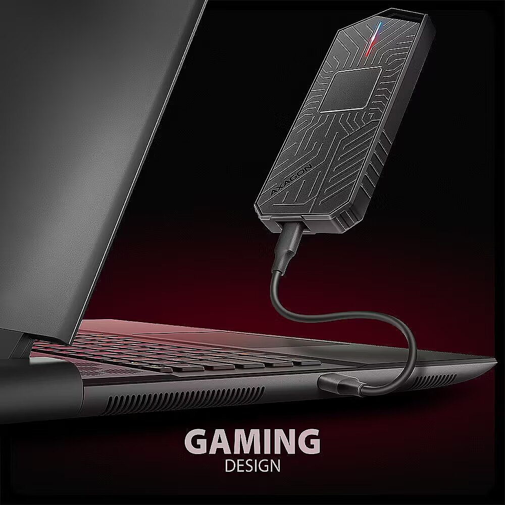 LongDesc - Gaming external AXAGON EEM2-GAM GAME M.2 box with USB 10Gbps interface for M.2 NVMe or SATA SSD disks. The double-sided USB-C connector on the box enables a reliable connection. In the package you will find two cables to connect the box to your computer. One USB-C USB-C and the other USB-C USB-A. You can connect the box to any free USB port on the notebook.The transmission rate is up to 10Gb/s thanks to the fast USB 3.2 Gen 2 interface. The external M.2 box also supports other modern features e.g. UASP, TRIM and enables reading S.M.A.R.T. disk status monitoring information. A unique feature, thanks to the new chipset, is the possibility of using both M.2 NVMe and SATA disks. You don't have to think about what type of M.2 disk you put in the box. The advantage is the attachment of four different lengths of SSD cards - 30, 42, 60 and 80 mm. M.2 cards can be single-sided or double-sided. The box does not limit the capacity of inserted SSD.A great advantage is the screwless opening of the box. Just press the button on the side to release the bottom cover. Changing discs is so easy and fast.The stylish frame for M.2 drives will impress you with its premium gaming design in black with an elegant surface that will perfectly highlight your gaming setup. The RGB LED indication adds a stylish look and blends perfectly with any gaming laptop, further enhancing the atmosphere of your gaming environment. Also included is a functional sleeve that protects the box opening button, increases overall protection, and offers a loop for hanging.Aluminum box body and thermal conductive pad provides ideal cooling for the inserted M.2 SSD. This extends the life of the disk and prevents slowing down of the disk speed, so called. Thermal Throttling.Inserting an M.2 SSD into this box easily creates a fast, compact and versatile external drive that can be used not only with PCs and laptops, but also with mobile phones and tablets. Input:• USB 10Gbps (USB 3.2 Gen 2), connector USB-C female.• Compatible with 480Mbps, USB 5Gbps, USB4 a Thunderbolt 3/4.Device support:• NVMe M.2 SSD disks,• SATA M.2 SSD disks, • designed for M key or B+M key card formats,• NGFF 75-pin M key slot for M.2 drives.Other features:• Supports transmission rates 10.000 / 5.000 / 480 Mbit/s.• Support of M key or B+M key NVMe (PCI-Express) and SATA (AHCI) M.2 SSDs without maximum capacity limitation.• Support of M.2 disks of these sizes – 2230, 2242, 2260, and 2280 mm.• Support of both one-sided and double-sided M.2 SSDs.• Compliant with PCI Express Base Specification Revision 3.1a specification.• Compliant with NVM Express 1.3 specification.• Compliant with Serial ATA 3.2 specification (SATA/600), bit rates of up to 6 Gb/s (600 MB/s).• Compliant with USB Mass Storage Class specification.• The total bandwidth / transmission rate of the adapter is determined by the USB interface used (theor. 10 Gbit/s).• The real adapter bandwidth / transmission rate is about 1000 MB/s (1 GB/s), it is given by the limits of the USB 3.2 Gen 2 interface.• Supports BOT (Bulk-Only Transport).• Supports UASP (USB Attached SCSI) for faster data transmission in Windows 8 and later.• Supports TRIM functionality to limit gradual degradation of the SSD performance over time.• Supports S.M.A.R.T. (Self-Monitoring, Analysis, and Reporting Technology) system monitoring disk condition.• SSD boot support in external box.• Possibility to connect your device while running thanks to the Hot Plug support.• Full Plug and Play support.• Power supply via USB bus up to 900mA from one USB port is sufficient in all cases.• RGB LED indication.• Heavy-duty aluminium body and thermal conductive pad helps to better cooling the M.2 SSD disk.• Higher box surface temperature is not a defect - thanks to the aluminum body, the heat generated by the disk operation is better drained and transferred to the environment.• Two USB type C or A male / USB type C male cable length 50 cm included in the package.Other data:• Box dimensions 13 x 130 x 55 mm (H x W x D).• Box weight 105 g (without cable and M.2 disk).Supported operating systems:• Windows 7 / 8.1 / 10 / 11 and later, macOS, iPadOS, iOS, Linux, Chrome OS and Android.• Compatibility is dependent on an updated operating system and support from the device manufacturer.• Note: when Windows 7 used it is necessary to check OS support and driver availability with the M.2 SSD manufacturer.Package contains:• USB-C 10Gbps external box for M.2 SSD,• protective sleeve,• USB-C - USB-C cable 50 cm long,• USB-A - USB-C cable 50 cm long,• 2 thermal conductive pads,• multilingual manual CZ / DE / DK / ENG / ESP / FIN / FR / GR / HR / HU / IT / NL / PL / PT / RO / SK / SWE / TR / UA / BG / CN / ARA• packed in a cardboard box with a hanging hole.