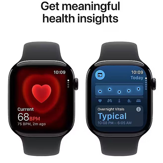 Hypertension, or high blood pressure, impacts over 1.3 billion adults worldwide and is a leading cause of a heart attack, stroke, and kidney disease. The condition frequently goes undiagnosed because it often has no symptoms — and even during a doctor’s visit, with a single measurement it can be easily missed. Receive hypertension notifications just by wearing your watch. Series 11 can notify you if it identifies patterns of hypertension. How? The optical sensor provides data to an algorithm that can detect potential hypertension by analyzing how your blood vessels respond to beats of the heart over 30-day periods. Groundbreaking insights. Grounded in science. We developed hypertension notifications using advanced machine learning methods and a series of studies totaling over 100,000 participants. The feature was then validated in a clinical study. Set up a blood pressure log. If you receive a hypertension notification and have access to a blood pressure cuff, you can track your blood pressure in the Health app on iPhone to create a report that will lead to more meaningful conversations with your healthcare provider. More features to empower your health. Wake up to your sleep score. Sleep quality is influenced by factors such as sleep duration, bedtime consistency, how often you wake up, and time spent in each sleep stage. Sleep score analyzes these factors every night and provides a classification and a score. You’ll see how the score is calculated, so you can understand the quality of your sleep and learn how to make it more restorative. Wake up to your sleep score. Sleep quality is influenced by factors such as sleep duration, bedtime consistency, how often you wake up, and time spent in each sleep stage. Sleep score analyzes these factors every night and provides a classification and a score. You’ll see how the score is calculated, so you can understand the quality of your sleep and learn how to make it more restorative. The Vitals app. Your daily health status, stat. Quickly see your overnight health data — including heart rate, respiratory rate, wrist temperature, and sleep duration — and get notified if multiple metrics are ever outside your typical range. Follow your heart on the ECG app. With Series 11 you can check for signs of atrial fibrillation, or AFib, right from your wrist by using the ECG app to generate a single-lead electrocardiogram. Stay on the pulse with the Heart Rate app. You can check your heart rate at any time — and get automatic notifications for a high or low heart rate or an irregular rhythm. Cycle Tracking keeps you in the loop. Since cycles vary, the best way to understand what’s normal for you is by tracking your menstrual cycle. You can use Cycle Tracking to log your period, record symptoms, and get predictions about your next period or fertile window. It can also notify you if a cycle deviation is detected. Get retrospective ovulation estimates. Series 11 has advanced sensors that track your wrist temperature while you sleep. The Cycle Tracking app uses this data to provide a retrospective estimate of when you likely ovulated, which can be helpful for family planning. Measure your blood oxygen. It’s a breathtaking innovation. The Health app on iPhone uses data from the sensor in Apple Watch to enable you to take on-demand readings of your blood oxygen as well as background readings, day and night. Fitness Better by every measure.