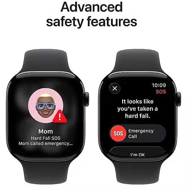 Packed with innovative safety firsts, Apple Watch Series 11 has your back. It’s designed to summon help when you need it most — even if you can’t reach your iPhone. Emergency SOS. ASAP. Need urgent help? Just press and hold the side button on your Apple Watch Series 11 to try to call emergency services and share your location. Fall Detection at the ready. If Series 11 detects that you’ve taken a hard fall, it can automatically help connect you with emergency services, provide dispatchers with your location, and notify loved ones. Crash Detection. Your guardian on the go. If you’ve been in a severe car crash, Series 11 can automatically help call emergency services, share your location, and notify your emergency contacts.