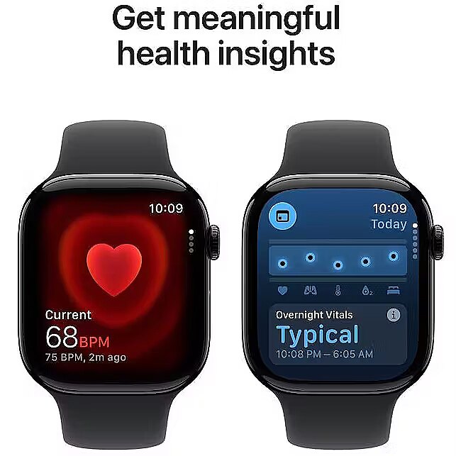 Hypertension, or high blood pressure, impacts over 1.3 billion adults worldwide and is a leading cause of a heart attack, stroke, and kidney disease. The condition frequently goes undiagnosed because it often has no symptoms — and even during a doctor’s visit, with a single measurement it can be easily missed. Receive hypertension notifications just by wearing your watch. Series 11 can notify you if it identifies patterns of hypertension. How? The optical sensor provides data to an algorithm that can detect potential hypertension by analyzing how your blood vessels respond to beats of the heart over 30-day periods. Groundbreaking insights. Grounded in science. We developed hypertension notifications using advanced machine learning methods and a series of studies totaling over 100,000 participants. The feature was then validated in a clinical study. Set up a blood pressure log. If you receive a hypertension notification and have access to a blood pressure cuff, you can track your blood pressure in the Health app on iPhone to create a report that will lead to more meaningful conversations with your healthcare provider. More features to empower your health. Wake up to your sleep score. Sleep quality is influenced by factors such as sleep duration, bedtime consistency, how often you wake up, and time spent in each sleep stage. Sleep score analyzes these factors every night and provides a classification and a score. You’ll see how the score is calculated, so you can understand the quality of your sleep and learn how to make it more restorative. Wake up to your sleep score. Sleep quality is influenced by factors such as sleep duration, bedtime consistency, how often you wake up, and time spent in each sleep stage. Sleep score analyzes these factors every night and provides a classification and a score. You’ll see how the score is calculated, so you can understand the quality of your sleep and learn how to make it more restorative. The Vitals app. Your daily health status, stat. Quickly see your overnight health data — including heart rate, respiratory rate, wrist temperature, and sleep duration — and get notified if multiple metrics are ever outside your typical range. Follow your heart on the ECG app. With Series 11 you can check for signs of atrial fibrillation, or AFib, right from your wrist by using the ECG app to generate a single-lead electrocardiogram. Stay on the pulse with the Heart Rate app. You can check your heart rate at any time — and get automatic notifications for a high or low heart rate or an irregular rhythm. Cycle Tracking keeps you in the loop. Since cycles vary, the best way to understand what’s normal for you is by tracking your menstrual cycle. You can use Cycle Tracking to log your period, record symptoms, and get predictions about your next period or fertile window. It can also notify you if a cycle deviation is detected. Get retrospective ovulation estimates. Series 11 has advanced sensors that track your wrist temperature while you sleep. The Cycle Tracking app uses this data to provide a retrospective estimate of when you likely ovulated, which can be helpful for family planning. Measure your blood oxygen. It’s a breathtaking innovation. The Health app on iPhone uses data from the sensor in Apple Watch to enable you to take on-demand readings of your blood oxygen as well as background readings, day and night. Fitness Better by every measure.