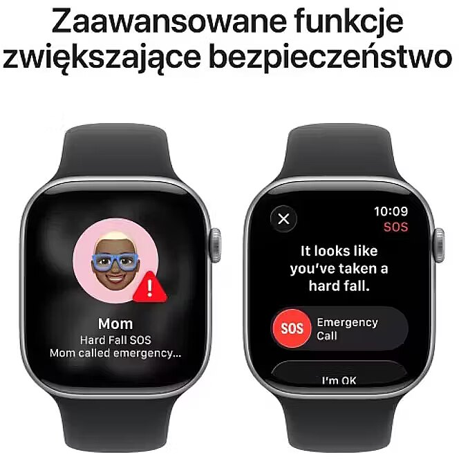 Jeszcze dłuższa praca baterii? Mamy to. Bateria Apple Watch Series 11 wystarcza nawet na 24 godziny normalnej pracy. Ogromny skok wydajności sprawia, że po całym dniu nie musisz zdejmować zegarka na noc, żeby go naładować. Dzięki temu masz lepszą wiedzę na temat swojego zdrowia. Sieć komórkowa to pełna swoboda Dzwoń i tekstuj. Series 11 obsługuje sieć komórkową. Z planem taryfowem jesteś w kontakcie niemal wszędzie, nawet jeśli na czas biegania Twój iPhone został w domu. Apple Watch Series 11 z kopertą z tytanu w kolorze naturalnym, pleciona opaska Solo w kolorze szarozielonym, połączenie przychodzące, widać zdjęcie osoby dzwoniącej, przyciski akceptacji lub odrzucenia połączenia, widać prawy bok urządzenia i pokrętło Digital Crown Zrobisz wszystko skinieniem. Szybkim obrotem nadgarstka wyciszysz przychodzące połączenie, wyłączysz minutnik, odrzucisz powiadomienie i nie tylko. Poręczne rozwiązanie, gdy masz zajęte ręce. Apple Pay. Pieniądze masz dosłownie pod ręką. Małe zakupy w biegu? Jednym stuknięciem w Apple Watch zapłacisz niemal za wszystko w miejscach oznaczonych symbolem płatności zbliżeniowych. Szybko i łatwo. Znajdź swojego iPhonea. Jeśli Twój iPhone gdzieś się zawieruszył, funkcja Znajdowanie dokładne wskaże Ci odległość od niego i kierunek. Kiedy zbliżysz się do urządzenia, dotykowe sygnały zwrotne i dźwiękowe oraz graficzny wskaźnik pomogą je zlokalizować. Stos inteligentny daje wskazówki. Sztos. Udoskonalone algorytmy predykcyjne wyciągają wnioski z danych gromadzonych na urządzeniu oraz analizy Twoich codziennych nawyków. Dzięki temu Stos inteligentny może dyskretnie zasugerować to, co w danej chwili przyda Ci się najbardziej. O, spójrz! Czas pobiegać. Bonjour. Tu Tłumaczenie na żywo. Dzięki Apple Intelligence na Twoim iPhonie aplikacja Wiadomości automatycznie tłumaczy tekst na wybrany język. No i to rozumiem. Funkcja dostępna w wybranych językach. Jego supermoc? Wzywa pomoc. Apple Watch Series 11 jest pełen innowacyjnych rozwiązań stworzonych z myślą o Twoim bezpieczeństwie. Zaprojektowaliśmy go tak, żeby wezwał pomoc, gdy jej najbardziej potrzebujesz. Nawet gdy nie masz przy sobie iPhone'a. Alarmowe SOS. ASAP. Pilnie potrzebujesz pomocy? Jeśli naciśniesz i przytrzymasz przycisk boczny, Apple Watch Series 11 postara się wezwać służby ratunkowe i udostępnić im Twoje położenie. Funkcja Wykrywanie upadków w pogotowiu. Apple Watch Series 11 wykrywa niebezpieczne upadki i pomaga wezwać służby ratunkowe. Ponadto przekazuje dyspozytorom informacje o Twojej lokalizacji i powiadamia bliskich. Chroni Cię funkcja Wykrywanie wypadków. Gdziekolwiek jesteś. W razie poważnego zderzenia samochodowego Series 11 automatycznie pomoże wezwać służby ratunkowe i powiadomi Twoje kontakty alarmowe. Wychodzisz? Zamelduj się. Dzięki funkcji Daj znać zegarek automatycznie powiadomi wybrane przez Ciebie osoby o dotarciu do celu. A jeśli idziesz pobiegać po zmroku, sesję Daj znać możesz uruchomić na czas treningu, żeby poinformować bliskich o jego zakończeniu. Z funkcją Ślad wrócisz na właściwe tory. Funkcja Ślad w apce Kompas potrafi automatycznie odtworzyć pokonaną przez Ciebie trasę, korzystając z danych GPS nawet gdy nie masz zasięgu. Możesz też łatwo dodać punkty nawigacyjne, takie jak miejsce wejścia na szlak czy obozowisko. Skonfiguruj swoją kartę medyczną. W razie wypadku Apple Watch Series 11 zapewni ratownikom szybki i bezpośredni dostęp do najważniejszych informacji o Twoim zdrowiu, takich jak alergie lub przyjmowane leki.