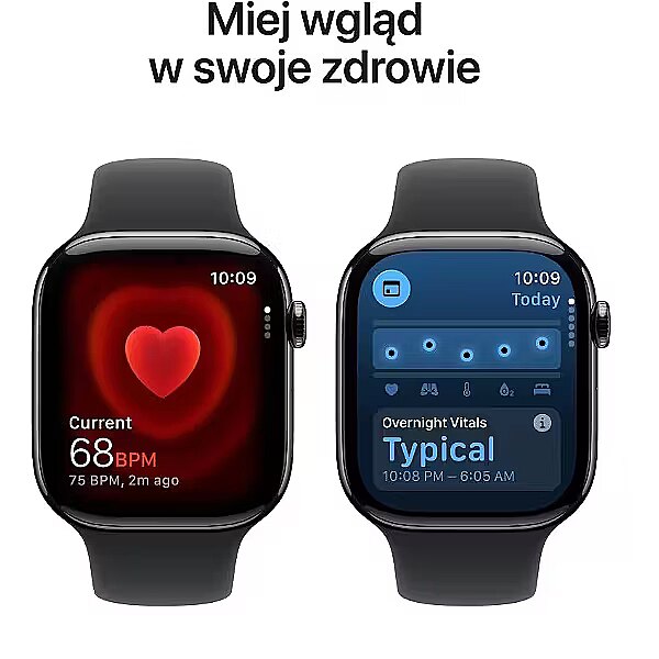 Description - Get to know it from every angle Refined design. The Series 11 is the slimmest Apple Watch. You can comfortably wear it all day, even while sleeping, which makes monitoring vital signs easier. Greater battery performance. Tireless battery, sufficient for up to 24 hours of normal use on a full charge. And up to 8 hours with just 15 minutes of charging. Advanced sensors. When it comes to health, you can always keep your finger on the pulse. The Apple Watch Series 11 uses innovative sensors, including two that measure heart rate and wrist temperature. Durable IonX display. The Series 11 display is twice as scratch-resistant as the Series 10 display and ready for everything the day brings. Water and dust resistance. The Apple Watch Series 11 has a WR 50M water resistance rating, making it perfect for the pool or sea up to 6 meters deep. And the IP6X standard makes it completely dustproof. About your heart health The more you know about your health, the more effectively you can take care of it. With the Apple Watch Series 11, you get a fuller picture. With apps like ECG and Vital Signs, you can monitor your condition in real time. And the groundbreaking High Blood Pressure Notifications feature is invaluable for heart health prevention. High Blood Pressure Notifications High blood pressure affects over 1.3 billion people worldwide and is a leading cause of heart attack, stroke, or kidney disease. It shows no symptoms, so it often goes undiagnosed. It can even be missed during a doctors visit, because usually only one blood pressure measurement is taken. To receive high blood pressure notifications, you only need to wear the watch for a minimum of 30 days. The Series 11 will let you know if it detects symptoms of possible high blood pressure. How does it work? The optical sensor collects data, which is then analyzed by an algorithm for possible hypertension. To do this, it checks the response of blood vessels to heartbeats over a 30-day period. A completely new perspective. Solid scientific basis. High Blood Pressure Notifications is a groundbreaking feature created using advanced machine learning methods and a series of scientific studies. Over 100,000 people participated in these studies. The final step was testing the feature in clinical trials. Your blood pressure log. After receiving a high blood pressure notification, you can start keeping a log of measurements in the Health app on your iPhone. You will need a blood pressure monitor for this. Your log will make communication with your doctor easier. More health-supporting features Check your sleep quality first thing in the morning. Sleep quality is influenced by factors like duration, consistent bedtime, number of awakenings, and time spent in each sleep phase. The Sleep Score feature analyzes these factors every night and presents a summary in the morning in an easy-to-read report. This way, youll know exactly what affects your sleep quality and how to make it more restorative. Dont ignore sleep apnea. It involves repeated episodes of stopped breathing during sleep. Untreated sleep apnea can increase the risk of high blood pressure, type 2 diabetes, heart disease, and other health problems. The Series 11 monitors breathing disturbances during sleep and alerts you to possible sleep apnea. Vital Signs app. Get insight into your daily health at a glance. You can quickly check data recorded overnight, including heart rate, respiratory rate, wrist temperature, blood oxygen, and sleep duration. You will also receive a notification if values fall outside normal ranges. ECG app. Heart in the palm of your hand. The ECG app in Series 11 can detect signs of atrial fibrillation and irregular heart rhythms. Measurements are taken directly from the wrist in a similar way to a single-lead electrocardiogram. With the Heart Rate app, keep your finger on the pulse. You can check it anytime. Youll also receive notifications if your heart rate is too high or too low, or if arrhythmia occurs. Cycle Tracking keeps you up to date. Every menstrual cycle is different. By observing yours, youll better understand its rhythm. The Cycle Tracking feature lets you record your period and accompanying symptoms. Youll receive a predicted date for your next period and fertile days. The feature will also notify you of unusual cycle patterns. Estimated ovulation time based on previous data. The Series 11 has an advanced sensor that monitors your temperature while you sleep. The Cycle Tracking app uses this data to determine the probable ovulation time. This information is extremely helpful for family planning. Blood oxygen measurement. A breathtaking innovation. The Apple Watch Series 11 is equipped with a sensor and app that measure blood oxygen both when you want to check and in the background, day and night. Who knows the results, gets results Whether you want to improve your treadmill or swimming performance, the Apple Watch Series 11 will help you train in countless ways. The device tracks every movement, analyzing many useful parameters. Because the more you know, the more you achieve. Sounds clever? Lets get started! Begin your workout with one click. Refreshed Workout app. Surprising in form. Its improved interface includes four new corner buttons, providing faster access to features like Base Pace, Route Race, and Custom Workout. Complete another lap of your Activity Rings. Move, Exercise, Stand. In the Activity app, the ring-closing animation reflects your movement. You can also pause rings and adjust your goals for each day of the week. Supports runners at every level No matter your running goals, the Apple Watch helps you achieve them easily. Durable battery, precise GPS, and motivating features that allow real-time tracking give you the perfect start. Time for your new personal record. Training load at a glance. With helpful analyses, youll better understand how workout intensity affects your body. Youll know when to push harder and when to rest.