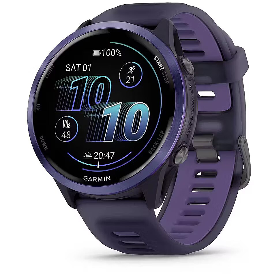 Description - Forerunner® 570 - 47mm Indigo Aluminium with Translucent Imperial Purple/Indigo Band BRIGHT 1.4-INCH AMOLED DISPLAY UP TO 18 HOURS OF BATTERY LIFE IN GPS MODE ADVANCED TRAINING AND RECOVERY FEATURES SATIQ™ TECHNOLOGY AND MULTI-BAND GPS LIGHTWEIGHT ALUMINUM BEZEL MUSIC ON YOUR WRIST
