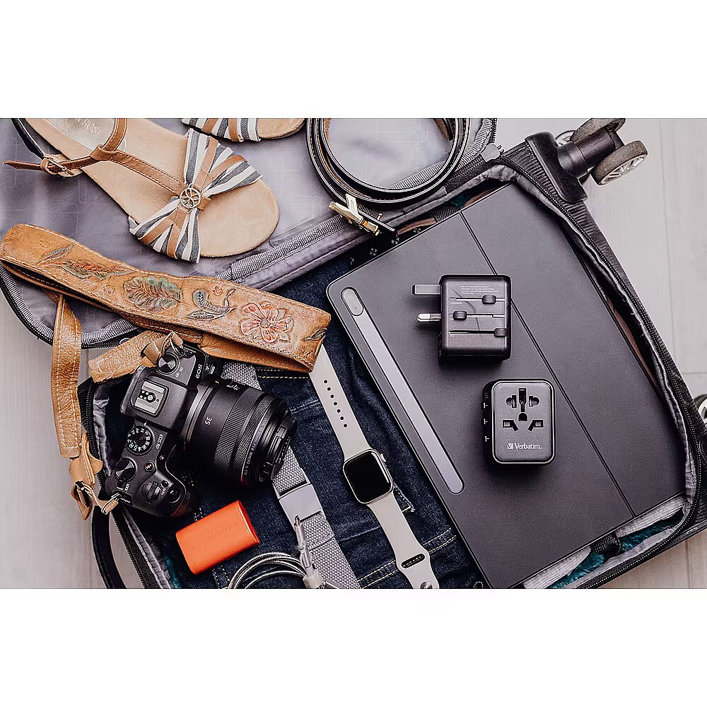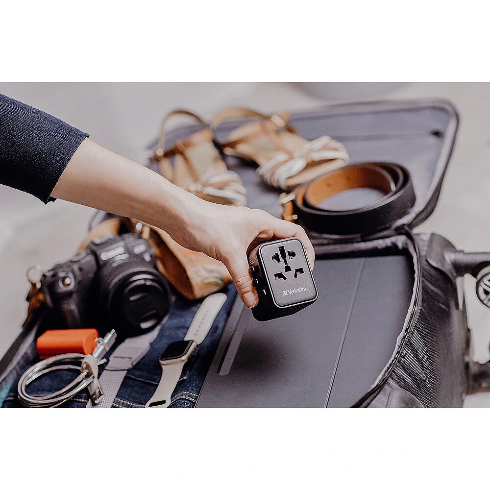 LongDesc - The Verbatim Universal Travel Adapter can be used in more than 180 countries – take it everywhere with you and never be out of power. This world-to-world multi plug will allow you to connect to any local power supply around the world and recharge your power-hungry devices, like laptops and camera batteries. The USB-C and USB-A ports on the bottom can charge all your USB devices including smartphones, Bluetooth speakers, tablets, power banks, and Kindles.Superfast 3-in-1 chargingThe compact and powerful Universal Travel Adapter allows 3 devices to be charged simultaneously through the AC power socket and the USB-A and USB-C ports.The USB-C port supports 20W Power Delivery (PD) and the USB-A port delivers 18W Quick Charge 3.0 output, providing superfast charging for all your USB devices.Just push the sliders on the side of the multi plug to reveal the three most common international plugs - EU, UK, and US - and rotate the pins for sockets in Australia or China.Compact and SafeCertified by CE, UKCA, FCC and ROHS, and made with high quality fireproof polycarbonate material, this Universal Adapter is perfect for daily use during your trip.It has safety shutters for child protection that can only be opened with force of more than 75N (7.5Kg) per hole, and itsBS1362 compliant fuse (including a spare) gives you 100% peace of mind wherever you may go.