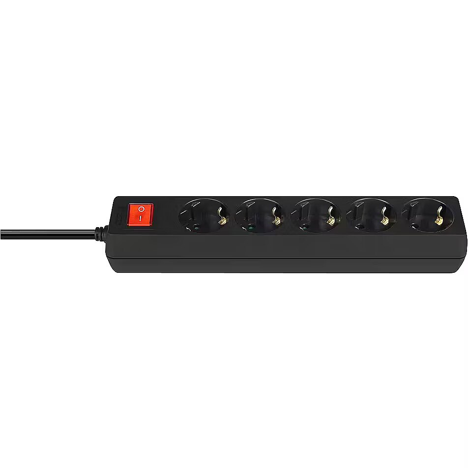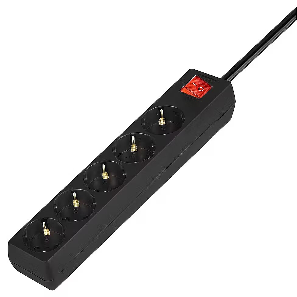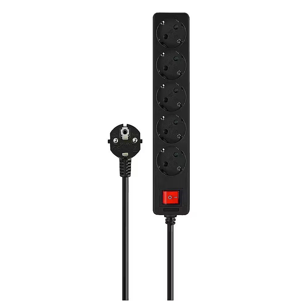 Other features - Anti-Fire Protection housing resistant to temperatures up to 650 °C Full copper cable 3 × 1.0 mm for durability and stable conductivity Maximum load: 2500 W (10 A) Rated voltage: 210250 V~, 50 Hz 5 grounded Schuko sockets ON/OFF switch convenient power control Cable length: 5 m Color: black cable, power strip with red switch