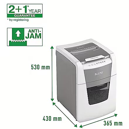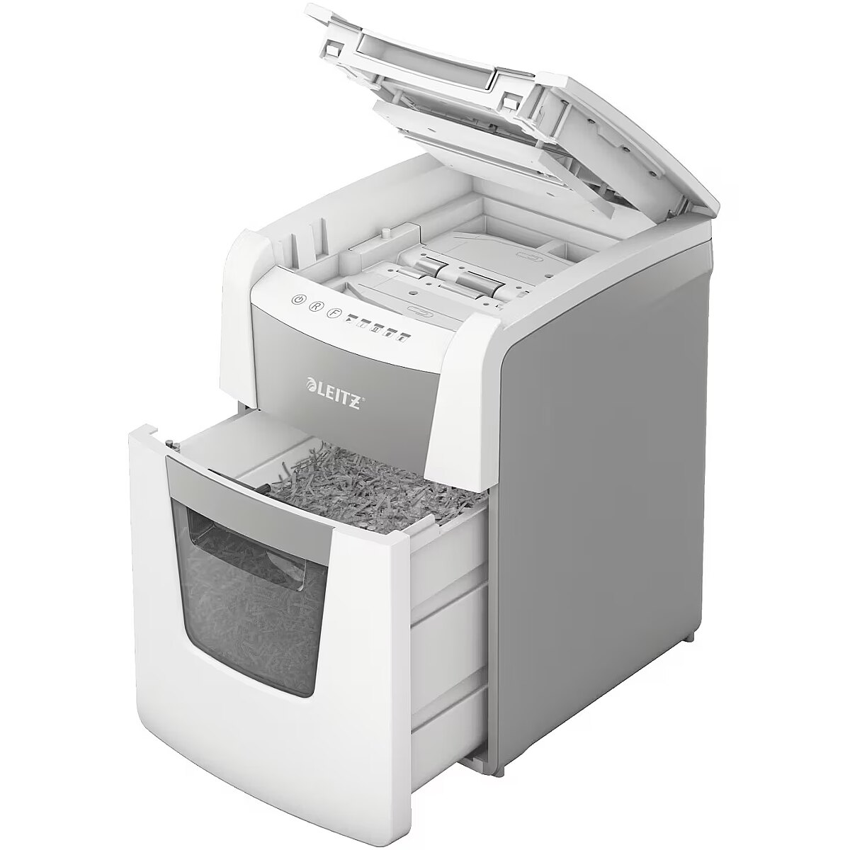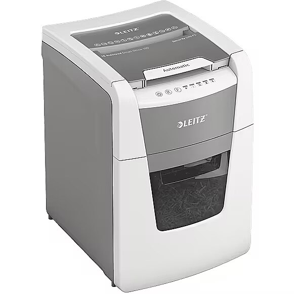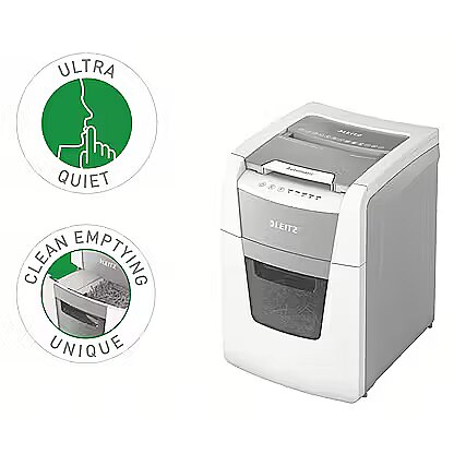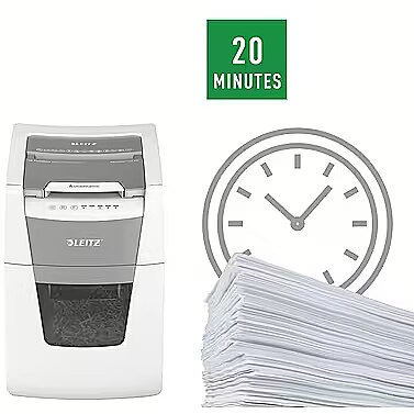 LongDesc - Fully automatic paper shredder from Leitz with unique clean emptying feature. So intelligent it quietly works on its own, just insert your stack of papers (incl. staples & paper clips), close the lid and get on with your day. Ideal for small office use. Higher security and excellent performance with this anti jam, quiet and long running (20 min) autofeed shredder. Automatically shred 100 sheets of A4 into security P5 (2x15mm) micro cut pieces in one go into the generous 34L bin. Simple operation using touch controls.