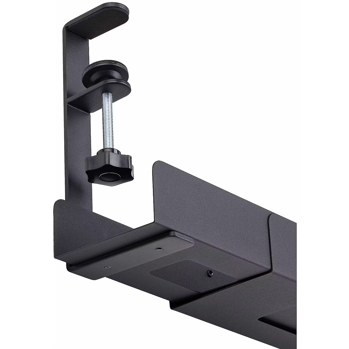 ShortSummaryDescription - StarTech.com Under Desk Cable Management Tray, Length Adjustable Cable Organizer, Clamp-On Installation, No Drilling Required, Power Bar Holder, Black, Cable tray, Desk, Steel, Black