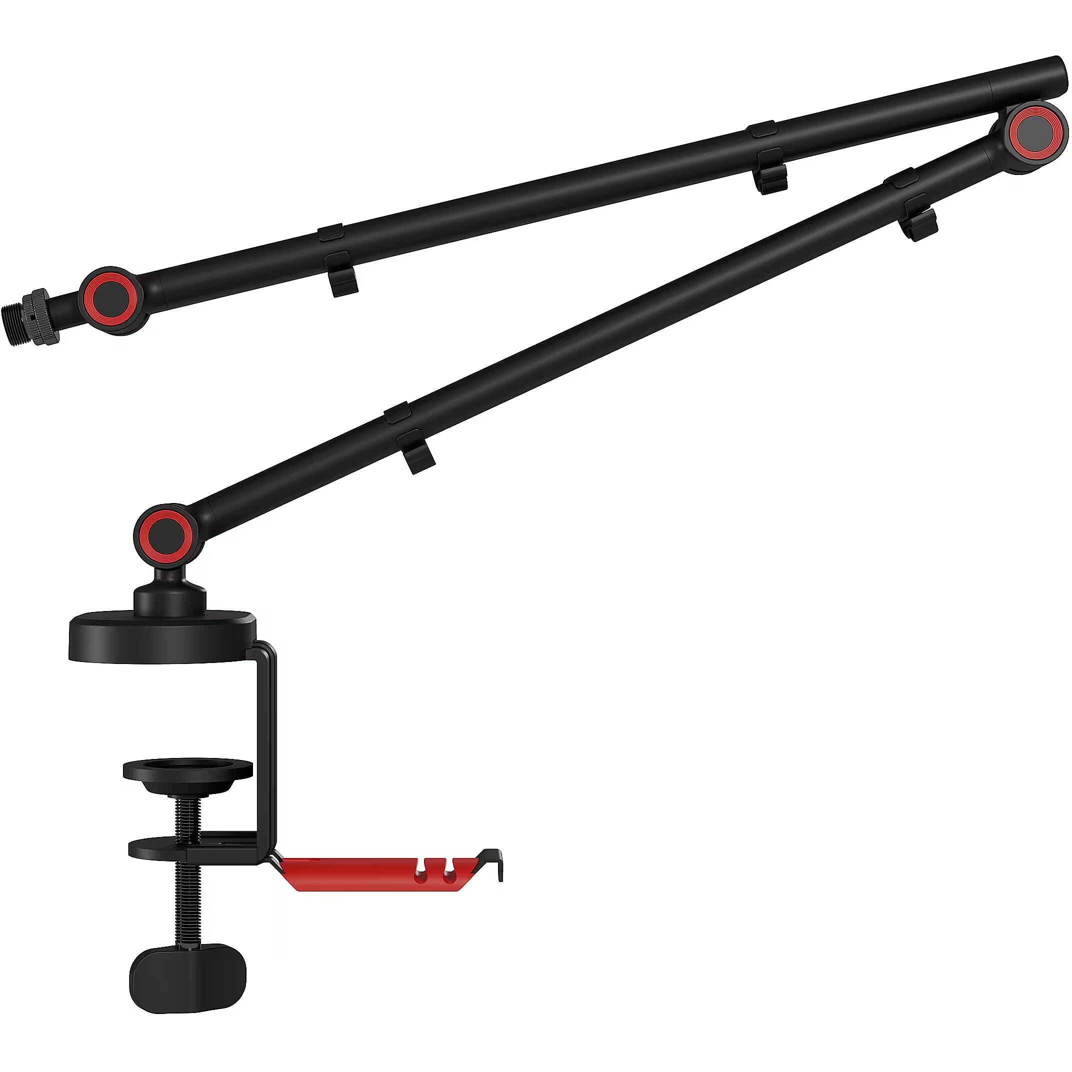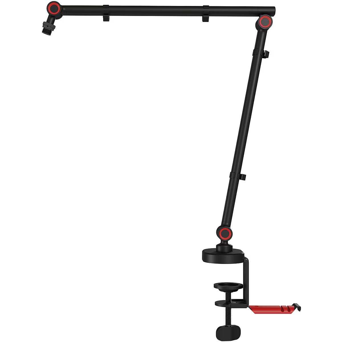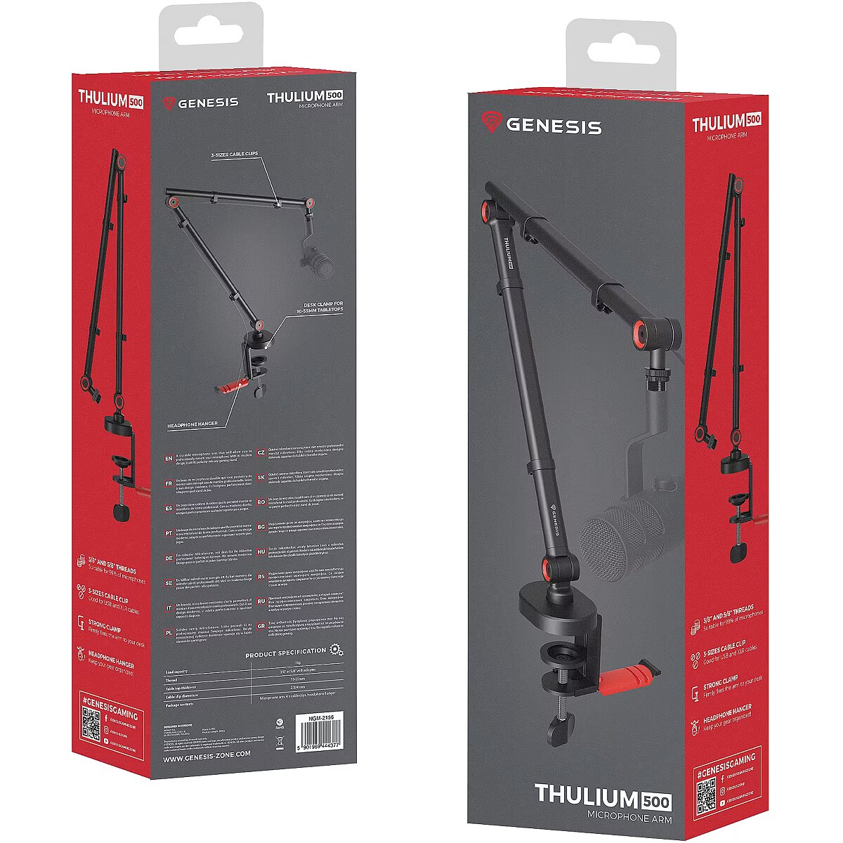 LongDesc - Meet the Thulium 500 - a versatile microphone arm that combines universal compatibility with compact size and modern, gaming-grade styling. With a load capacity of up to 1 kg and included 5/8" and 1/4" adapters, the Thulium 500 will work with 99% of commercially available microphones and a wide range of other audio/video accessories such as cameras, camcorders and additional lighting. Meet the Thulium 500 - a versatile microphone arm that combines universal compatibility with compact size and modern, gaming-grade styling. With a load capacity of up to 1 kg and included 5/8" and 1/4" adapters, the Thulium 500 will work with 99% of commercially available microphones and a wide range of other audio/video accessories such as cameras, camcorders and additional lighting. No visible springs, high functionality, 3-point adjustment and a headphone holder make it ideal for gamers, streamers and content creators. DURABLE CONSTRUCTION AND CONVENIENT ADJUSTMENTThe Thulium 500 microphone arm is distinguished by its exceptional robustness, providing excellent stability even for large and heavy microphones and other audiovisual equipment, such as cameras or additional lighting. Thanks to its sturdy construction, the arm remains stable in the set position, while it can be easily adjusted using a three-point allen thread adjustment system (wrench included). This is a key component that allows for professional recordings without vibration or shake, even with heavier microphone models like our flagship Radium 600 G2.UNIVERSAL, STABLE MOUNTSimple, intuitive yet extremely sturdy screw clamp mounting allows you to easily attach the Thulium 500 arm to any 10-55 mm thick tabletop. The arm's connection to the base ensures full stability while maintaining free rotation. Thanks to the relatively large surface area and elliptical shape of the base, the arm does not wobble and remains perfectly stable in any position, even loaded with the heaviest microphones or accessories.HEADPHONE HOLDER INCLUDEDDo you like to have everything conveniently at hand, while keeping your work and play area tidy with ease? Great for you, because another feature that sets the Thulium 500 arm apart is the included headset holder. Attached to the base of the arm with two screws that guarantee its full stability, the holder provides a dedicated place for your headphones, which no longer need to take up space on your desk or shelves. The mount additionally features 2 cable troughs, allowing you to route microphone and headphone cables at the same time. POSITION THE ARM EXACTLY AS YOU NEED ITThe design of the Thulium 500 arm is engineered for unrestricted freedom to adjust tilt angles. A three-point allen thread adjustment system allows the arm to be precisely positioned and locked in any position, providing full control over the angle of a microphone or other equipment. This makes it easy for users to adjust the settings to suit their individual needs, achieving optimal recording and working conditions without worrying about vibration or instability. The position lock will also work perfectly in cooperation with a smartphone, camcorder or camera, ensuring frame constancy between shots. UNIVERSAL ADAPTERS FOR VARIOUS DEVICESThe Thulium 500 comes with a discrete, blackened 3/8" to 5/8" adapter, allowing you to mount almost any microphone available on the market. In addition, the arm includes an adapter for 1/4" photographic threads, allowing the attachment of a wide range of other audio-visual devices such as cameras, camcorders, additional lighting or smartphone holders. The black matte color of the adapters perfectly matches the design of the arm, eliminating unwanted reflections during recordings with intense lighting.CLIPS FOR CABLES OF VARIOUS THICKNESSESFour cable clamps of 2mm, 3mm and 4mm thickness are included with the Thulium 500 arm, allowing you to conveniently route a variety of USB and XLR cables. This avoids cable slack, especially on thinner cables, and keeps your workspace tidy and aesthetically pleasing, which is extremely important in professional recording environments. Additional guides for cables are also included on the headphone rack, allowing you to route them the way you want. STYLISH AND ATTRACTIVE FINISHThe Thulium 500 arm is finished in a versatile combination of matte black with GENESIS red accents, giving it a sleek and universally appealing look on streams and videos. The cohesive design pairs perfectly with our Toron 531 headphones to create a stylish and professional gaming headset. The exclusive look of the arm fully reflects its high quality workmanship.