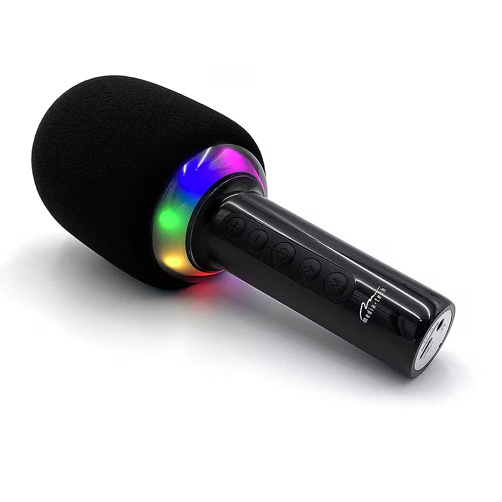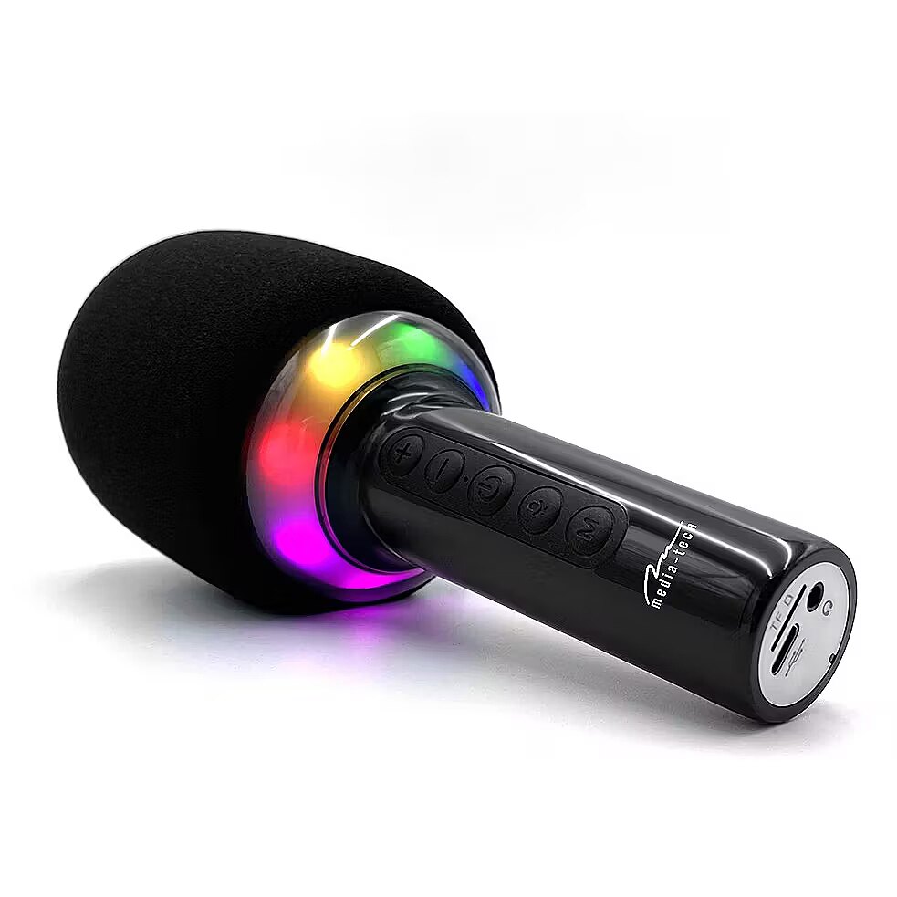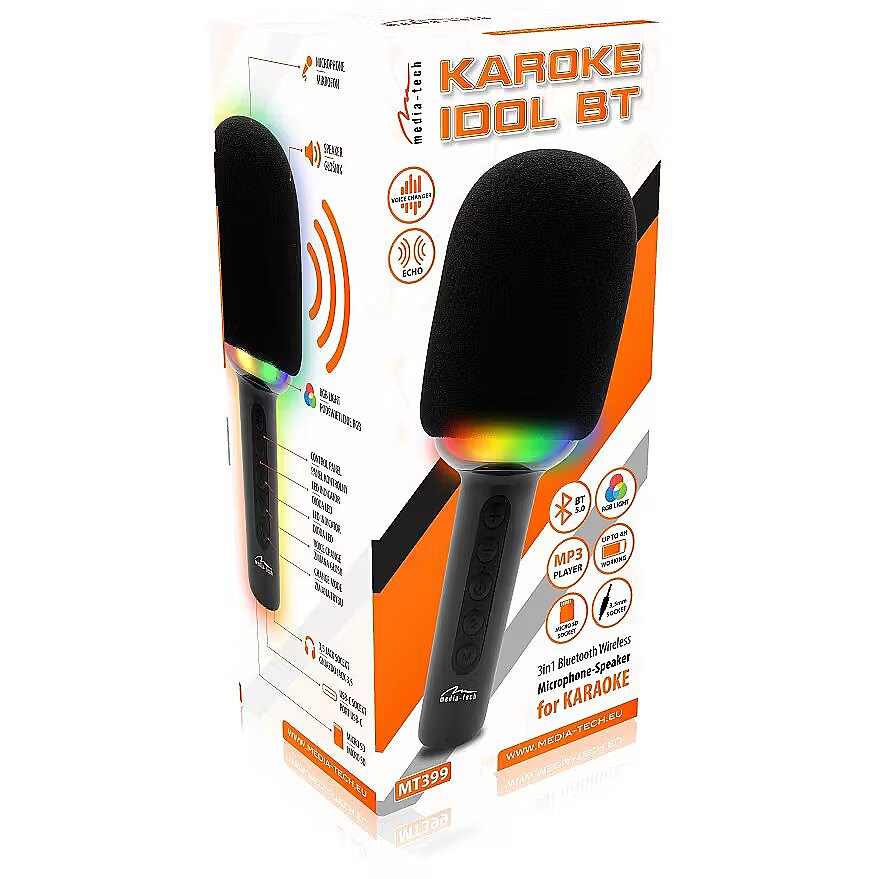 Description - Microphone with Bluetooth speaker KARAOKE IDOL BT MT399 Star-studded fun at your fingertips! Do you dream of karaoke without having to leave your home? KARAOKE IDOL BT MT399 you have your own karaoke wherever you want! The perfect gadget to get any party going and keep both kids and adults singing and having fun for hours. The wireless microphone with Bluetooth speaker guarantees that your music and voice will resound with the power you need to feel like a real star!   Voice Modulator Sing as you like! Who doesn't like to have a little fun with their voice? With the 5-mode modulator, you can not only sing, but also experiment with different voice sounds. Transform your voice LIVE, add a robot effect or other funny effects everyone will surely laugh out loud! The modulator is a real hit at parties and a great way to spice up any song. Every guest will find something for themselves and discover the hidden star of the stage within.   Impressive Disco Illumination Integrated multi-colour disco lighting adds magic to every karaoke party. Colourful lights in time with the music create an amazing atmosphere ideal for family evenings with children and meetings with friends! With this feature, your microphone not only plays but also lights up, attracting everyone's attention. Children will be delighted and adults will not be able to resist the temptation to grab the microphone and join in the fun.   Simple Operation and Many Possibilities Service KARAOKE IDOL BT MT399 is very simple pair the device via Bluetooth with your smartphone, launch the MP3 player, adjust the volume, and the echo effect will add a professional sound to your voice. Or maybe you have your favorite songs on a micro SD card? No problem, the microphone supports cards up to 64 GB, so you can have hundreds of songs at your fingertips!   Mobility and Power for Long Hours KARAOKE IDOL BT MT399 this device was created with comfort in mind the lithium battery provides up to 4 hours of continuous fun. With a range of up to 10 meters (at a distance from the smartphone), you can move freely around the entire room, feeling complete freedom on your private stage. The USB-C charging port guarantees fast charging, so after a short break the microphone is ready for another portion of hits!   Perfect for Everyone Regardless of age, KARAOKE IDOL BT MT399 is a gadget that will provide a lot of joy to anyone who loves having fun. It is light and comfortable, so it will be a great gift for children who love to sing and dance, as well as for adults who want to liven up the party atmosphere. Get your karaoke on and show who rules the stage!