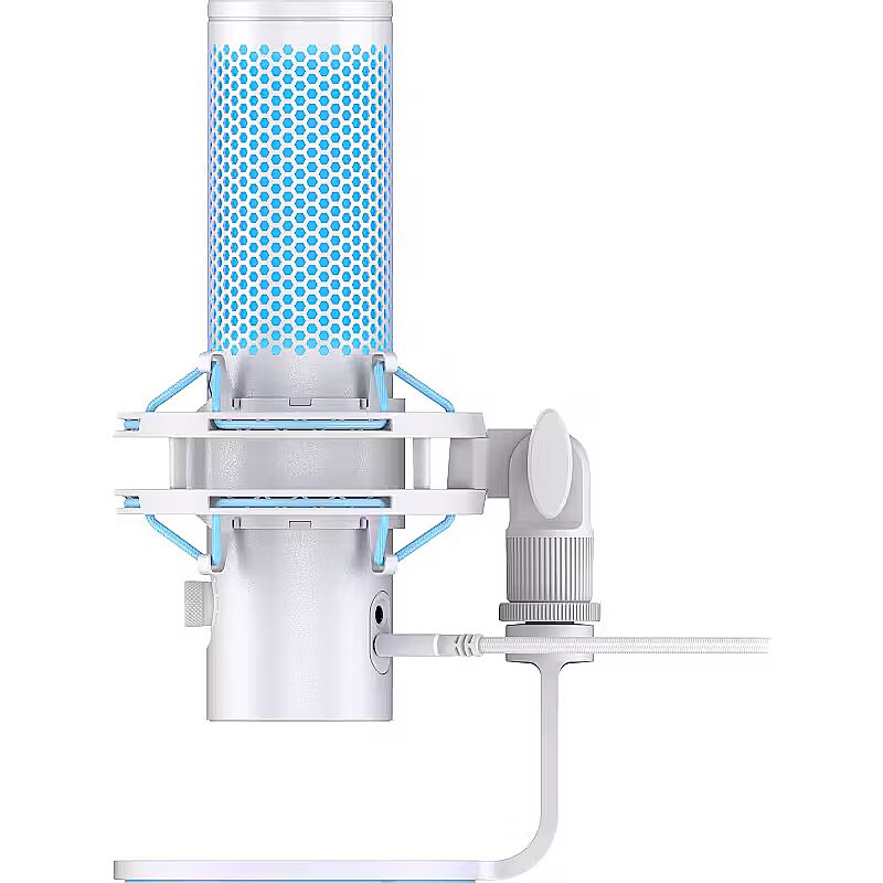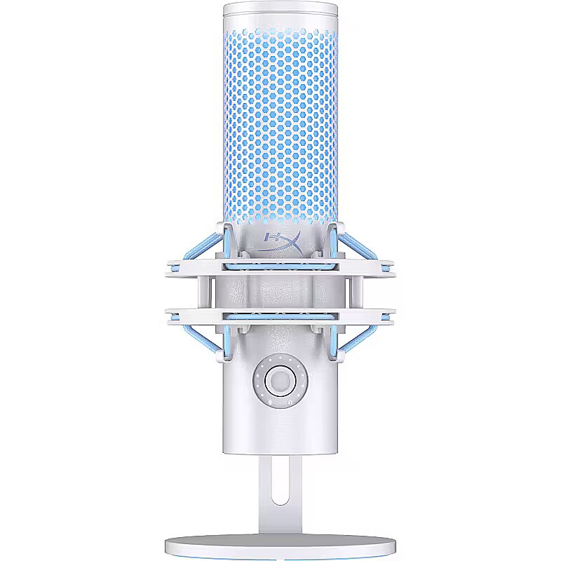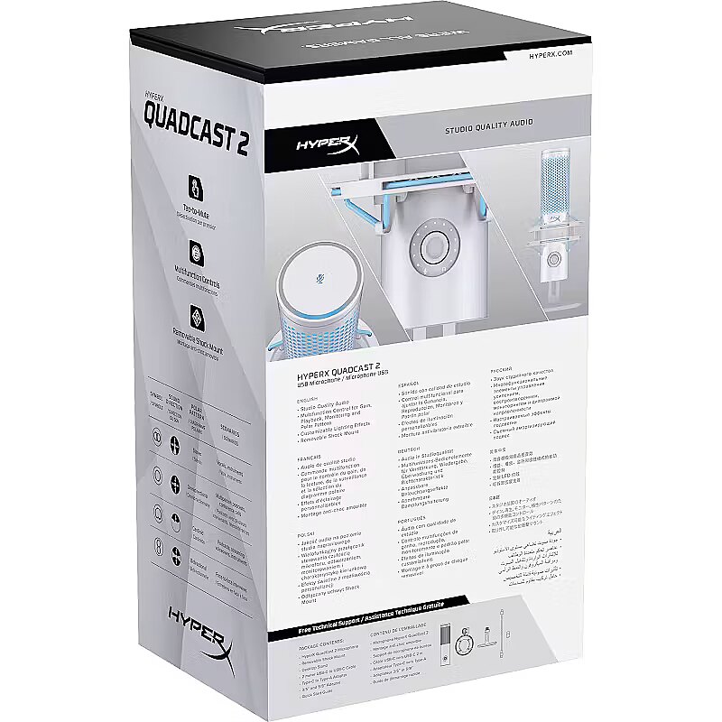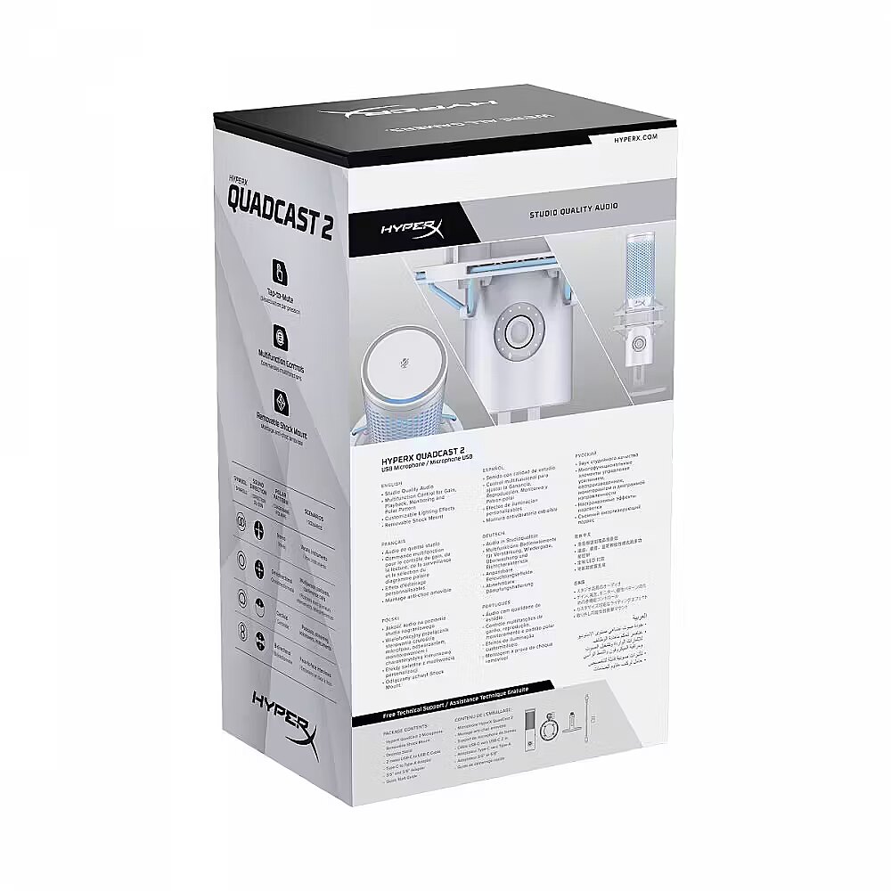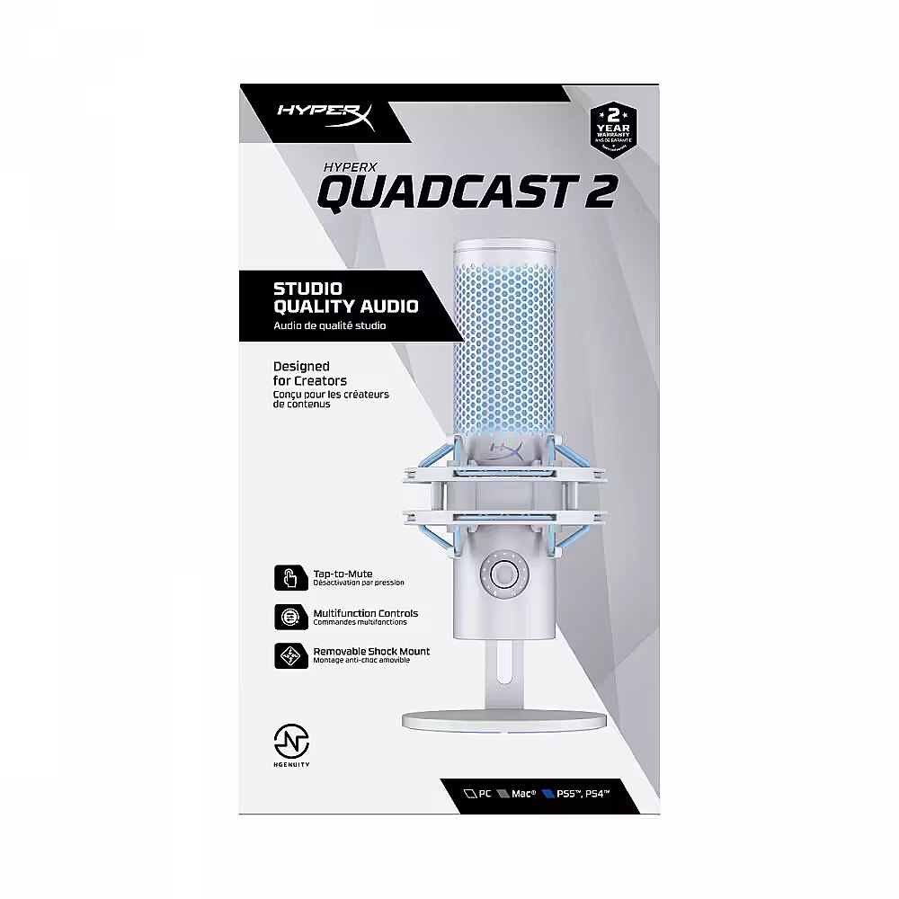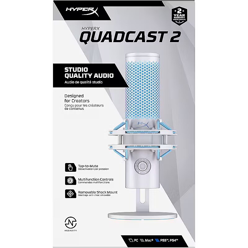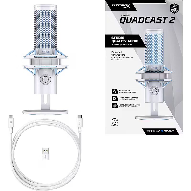 Description - HyperX QuadCast 2 - USB Microphone (Frost) (AN1D9AA) The HyperX QuadCast 2 refines everything that made the original such a favorite amongst gamers, streamers, and content creators around the world. All the fan-favorite features are still here: the iconic stunning lighting, the tap-to-mute sensor, 4 selectable polar patterns, 3.5mm headphone jack and included shock mount and desktop stand but now with a range of innovative additions and packaged in a new sleek, full aluminum silhouette. QuadCast 2 features upgraded 24-bit, 96kHz recording for a studio-quality recording experience. It also features a redesigned detachable shock mount with improved performance and innovative spring-loaded pins, making removal easy and allowing the use of universal shock mounts[1]. In response to our fan's feedback, QuadCast 2 now includes a multi-function knob so you can do everything on board without needing to alt-tab. The knob allows users to choose between microphone gain, playback volume, microphone monitoring volume, and can also switch polar patterns. The LED indicator also makes it easy to determine the current mic status without the hassle of going into the software. Users can choose different lighting effects and tune their mic via HyperX NGENUITY. The HyperX QuadCast 2 - the new standard for streaming microphones. Hi-Res Studio-Quality Recording