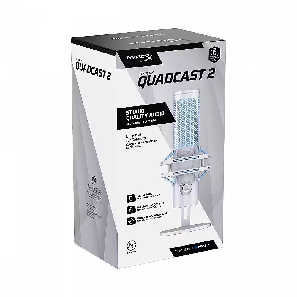 LongDesc - The New Standard.The HyperX QuadCast 2 refines everything that made the original such a favorite amongst gamers, streamers, and content creators around the world. All the fan-favorite features are still here: the iconic stunning lighting, the tap-to-mute sensor, 4 selectable polar patterns, 3.5mm headphone jack and included shock mount and desktop stand but now with a range of innovative additions and packaged in a new sleek, full aluminum silhouette. QuadCast 2 features upgraded 24-bit, 96kHz recording for a studio-quality recording experience. It also features a redesigned detachable shock mount with improved performance and innovative spring-loaded pins, making removal easy and allowing the use of universal shock mounts[1]. In response to our fan’s feedback, QuadCast 2 now includes a multi-function knob so you can do everything on board without needing to alt-tab. The knob allows users to choose between microphone gain, playback volume, microphone monitoring volume, and can also switch polar patterns. The LED indicator also makes it easy to determine the current mic status without the hassle of going into the software. Users can choose different lighting effects and tune their mic via HyperX NGENUITY. The HyperX QuadCast 2 – the new standard for streaming microphones.