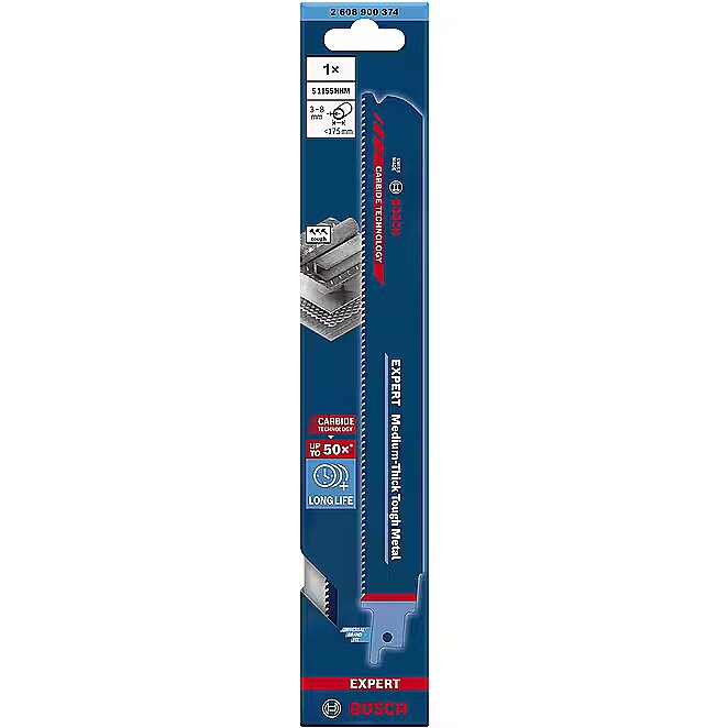 LongDesc - EXPERT Thick Tough Metal for Long Life Cutting Thick Tough MetalCutting thick metal such as steel profiles or heavy cast iron pipes is probably not the favourite part of your job. Plumbers, renovators and demolition workers alike know that this is a tough task which, even with a powerful recip saw, requires sweat and muscle. The EXPERT ‘Thick Tough Metal’ not only cuts thick metal, it offers exceptional lifespan in the toughest of applications.With the Bosch EXPERT ‘Thick Tough Metal’ Reciprocating Saw Blade, you might just start to enjoy cutting thick steel and cast iron.