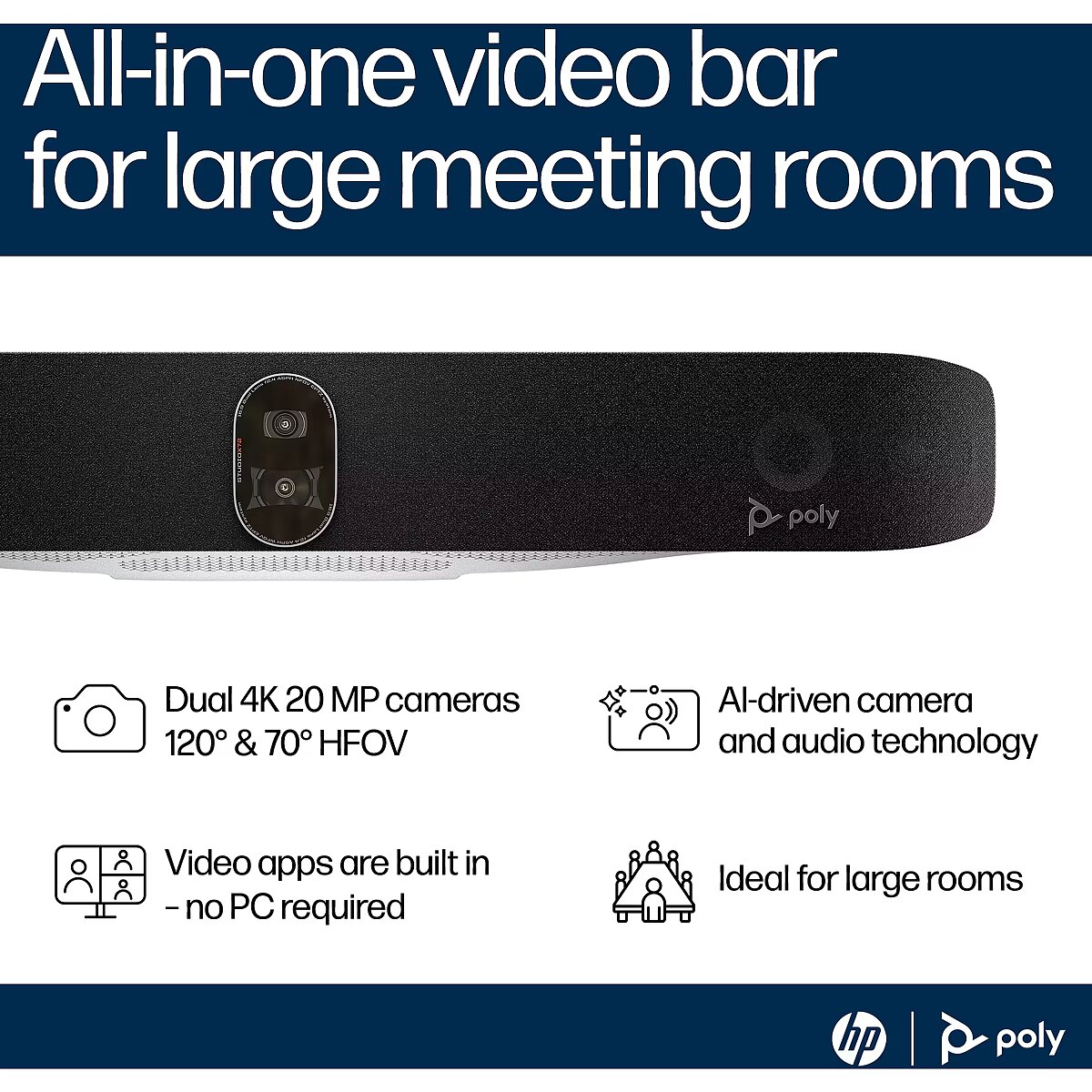 LongDesc - Made for big rooms and even bigger ideasDon’t let the size of the room slow your team down during hybrid meetings. Easily set up the Poly Studio X72 all-in-one video bar with AI-enhanced video and audio technology, seamless scalability and flexibility to join nearly any cloud video call.