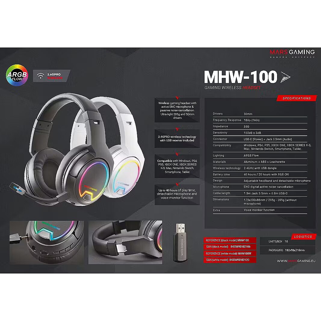 description_en - The Mars Gaming MHW-100 are wireless ARGB headphones with up to 40 hours of battery life, a detachable microphone with ENC digital noise reduction, VOICE MONITOR and universal compatibility.