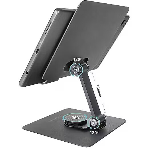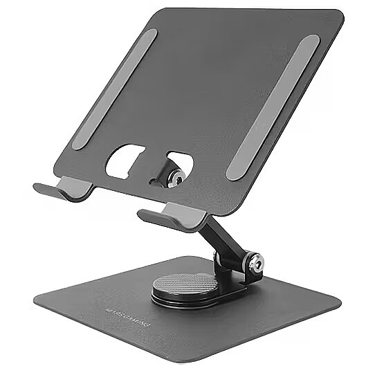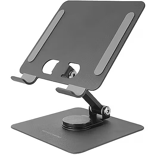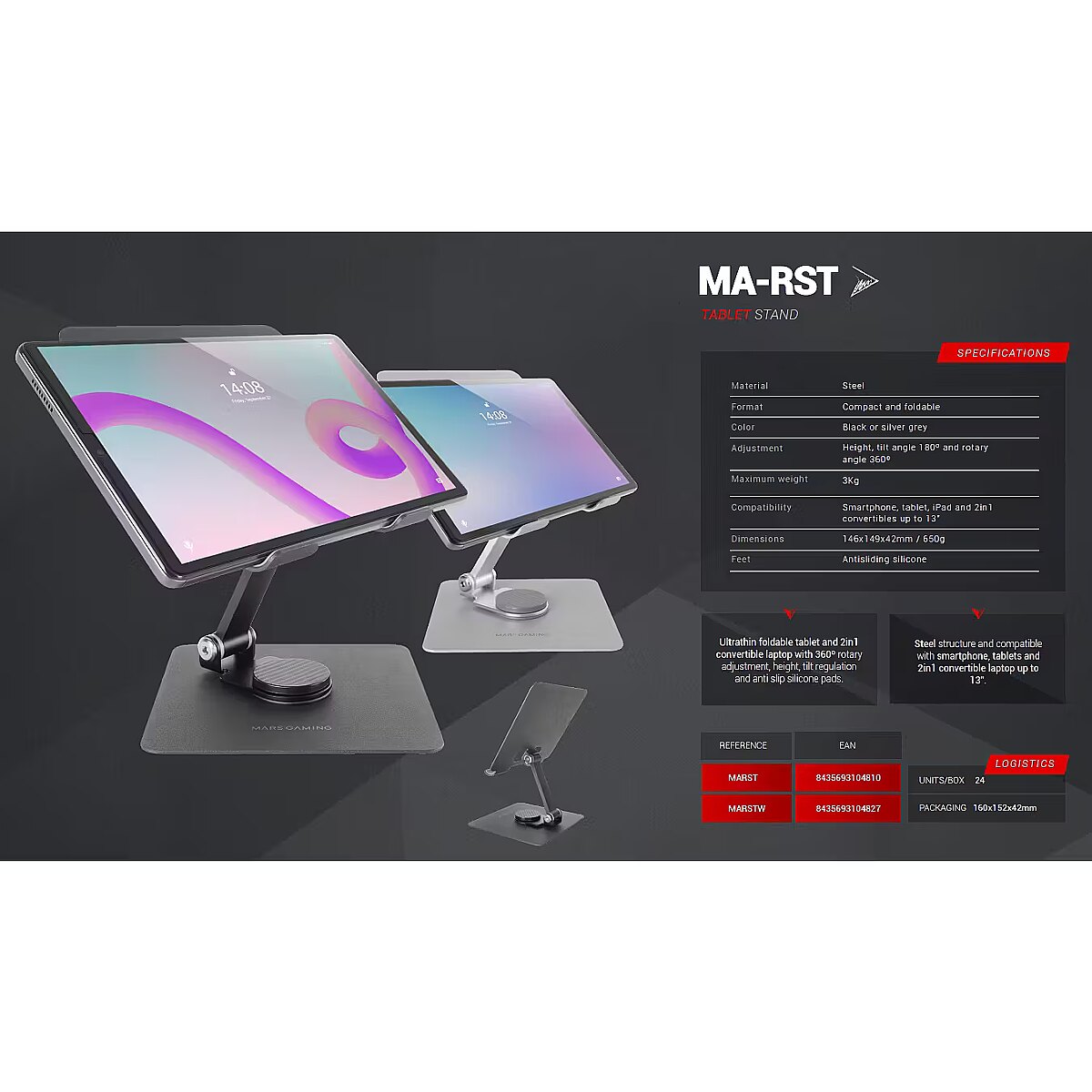LongDesc - Discover the MA-RST 2-in-1 convertible tablet and computer stand, the perfect combination of comfort, durability and design. Made of high-quality steel, this stand is lightweight, easy to transport and resistant. Its 360º rotation capacity and height adjustment up to 180º allow you to fully customize the angle of your device. Its ultra-thin, foldable design, suitable for devices up to 13 inches, optimizes your work or study space. In addition, its non-slip base with silicone pads provides exceptional stability.BUILT TO LAST: STEEL SUPPORTMade from high-quality materials, the MA-RST laptop stand is built to last. Its steel frame is not only lightweight, making it easy to transport and handle, but also incredibly durable. This stand stands up to daily use, keeping your devices safe and in the perfect ergonomic position.AVAILABLE IN TWO VERSIONSBLACK AND SILVER GREYChoose the one that best suits your setup!UNRIVALED STABILITY: NON-SLIP DESIGNStability is key when it comes to computer or tablet stands. That’s why the MA-RST tablet stand stands out with its advanced anti-slip and robust design, ensuring that your device remains safe and stable at all times. Its durable silicone pads protect your device from scratches and slipping, ensuring a comfortable and worry-free experience.360º ROTATION WITH INFINITE HEIGHT ADJUSTMENTWith a dynamic 360° swivel function and the possibility of adjusting the height and tilt angle by 180°, customize the angle and position of your device to suit your needs. This stand is ideal for studying, working or even reading and enjoying your favorite series, as it always ensures the most suitable angle, minimizing neck and back fatigue.ULTRA-THIN AND FOLDABLE STANDThis ultra-slim, foldable stand fits perfectly on tablets and 2-in-1 convertible laptops up to 13”. Thanks to its elegant, compact, foldable design that makes it easy to transport, you can always take it with you with ease. In addition to maximizing the efficiency of your work area, it becomes an ideal choice for professionals and students who seek functionality and style at the same time.