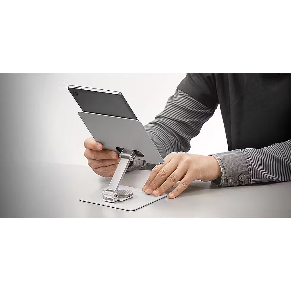 LongDesc - Discover the MA-RST 2-in-1 convertible tablet and computer stand, the perfect combination of comfort, durability and design. Made of high-quality steel, this stand is lightweight, easy to transport and resistant. Its 360º rotation capacity and height adjustment up to 180º allow you to fully customize the angle of your device. Its ultra-thin, foldable design, suitable for devices up to 13 inches, optimizes your work or study space. In addition, its non-slip base with silicone pads provides exceptional stability.BUILT TO LAST: STEEL SUPPORTMade from high-quality materials, the MA-RST laptop stand is built to last. Its steel frame is not only lightweight, making it easy to transport and handle, but also incredibly durable. This stand stands up to daily use, keeping your devices safe and in the perfect ergonomic position.AVAILABLE IN TWO VERSIONSBLACK AND SILVER GREYChoose the one that best suits your setup!UNRIVALED STABILITY: NON-SLIP DESIGNStability is key when it comes to computer or tablet stands. That’s why the MA-RST tablet stand stands out with its advanced anti-slip and robust design, ensuring that your device remains safe and stable at all times. Its durable silicone pads protect your device from scratches and slipping, ensuring a comfortable and worry-free experience.360º ROTATION WITH INFINITE HEIGHT ADJUSTMENTWith a dynamic 360° swivel function and the possibility of adjusting the height and tilt angle by 180°, customize the angle and position of your device to suit your needs. This stand is ideal for studying, working or even reading and enjoying your favorite series, as it always ensures the most suitable angle, minimizing neck and back fatigue.ULTRA-THIN AND FOLDABLE STANDThis ultra-slim, foldable stand fits perfectly on tablets and 2-in-1 convertible laptops up to 13”. Thanks to its elegant, compact, foldable design that makes it easy to transport, you can always take it with you with ease. In addition to maximizing the efficiency of your work area, it becomes an ideal choice for professionals and students who seek functionality and style at the same time.