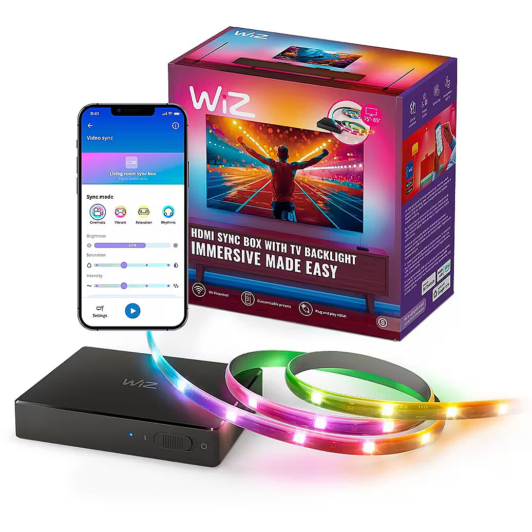 LongDescription EN - Transform your entertainment spaceThe HDMI Sync Box with RGBIC backlight for 75"–85" TVs elevates movies, games, and music by projecting your TV screen’s colours into the room in real time. Colours are matched precisely by analysing the HDMI signal, without the need for a camera or complicated calibration. Wide compatibility and premium qualitySupports 4K resolution at 60 Hz, HDR10+, and Dolby Vision, and works with any HDMI 2.0 device such as gaming consoles, streaming sticks, or set-top boxes. Full-room WiZ light syncConnect WiZ colour lights to create a complete lighting setup, whether you’re using bulbs, LED strips, or lamps, for a fully immersive ambience. Music mode with built-in microphoneEven with the TV off, lights can pulse to the beat of your music, making it perfect for parties or relaxation. Customisable controlUse the WiZ app to select pre-set modeslike Cinematic or Relaxation, or customise brightness and colours to suit your mood.