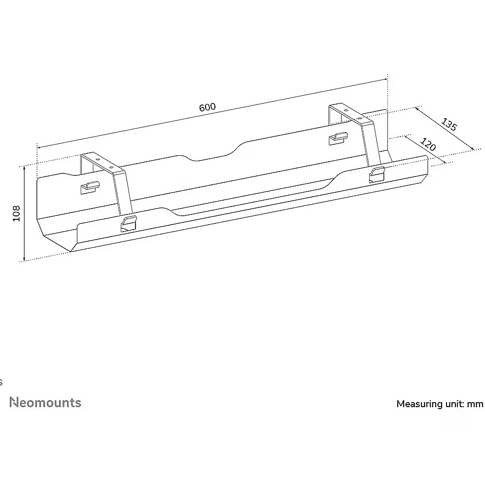 LongSummaryDescription - Neomounts ADS07-122WH Cable tray - screw-mounted - universal. Type: Cable tray, Purpose: Desk, Product colour: White. Width: 600 mm, Depth: 135 mm, Height: 108 mm. Package width: 90 mm, Package depth: 607 mm, Package height: 125 mm. Quantity per pack: 1 pc(s). Master (outer) case width: 380 mm, Master (outer) case length: 395 mm, Master (outer) case height: 625 mm